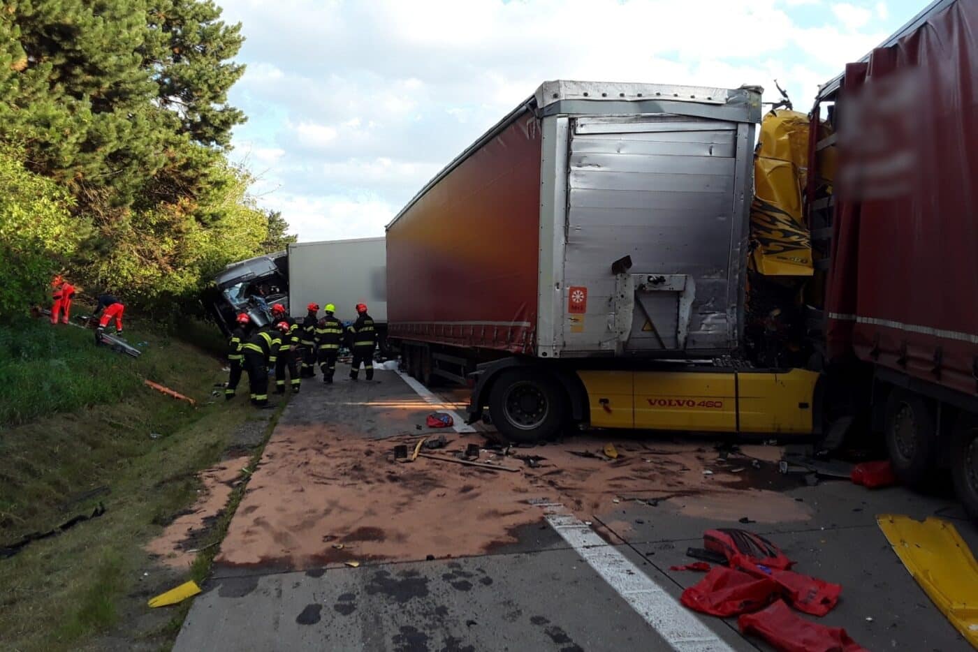 Havárie se stala v pondělí před 18. hodinou na 11. kilometru ve směru na Brno na úrovni Blučiny. Vrazily tam do sebe čtyři kamiony a náklaďák. Vozy skončily značně zdemolované. Hasiči museli z kabin vyprostit dva lidi.