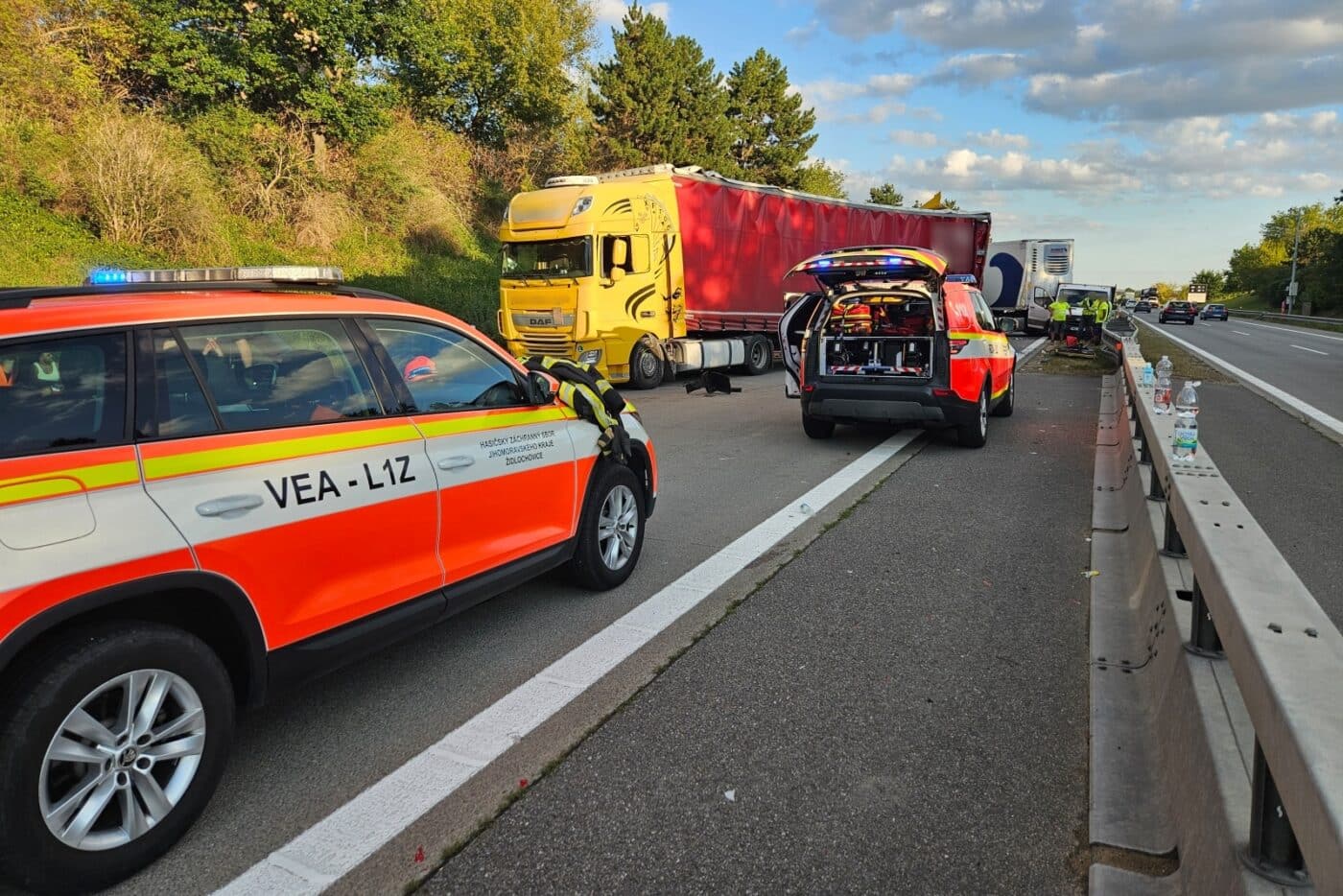 „Dálnice je uzavřená, dopravu odkláníme na 25. kilometru,“ sdělil mluvčí policie David Chaloupka. „Obnovení provozu bude trvat delší dobu. Osobní vozidla v koloně za nehodou policisté otáčí a vyvádějí z dálnice,“ dodal Chaloupka.
