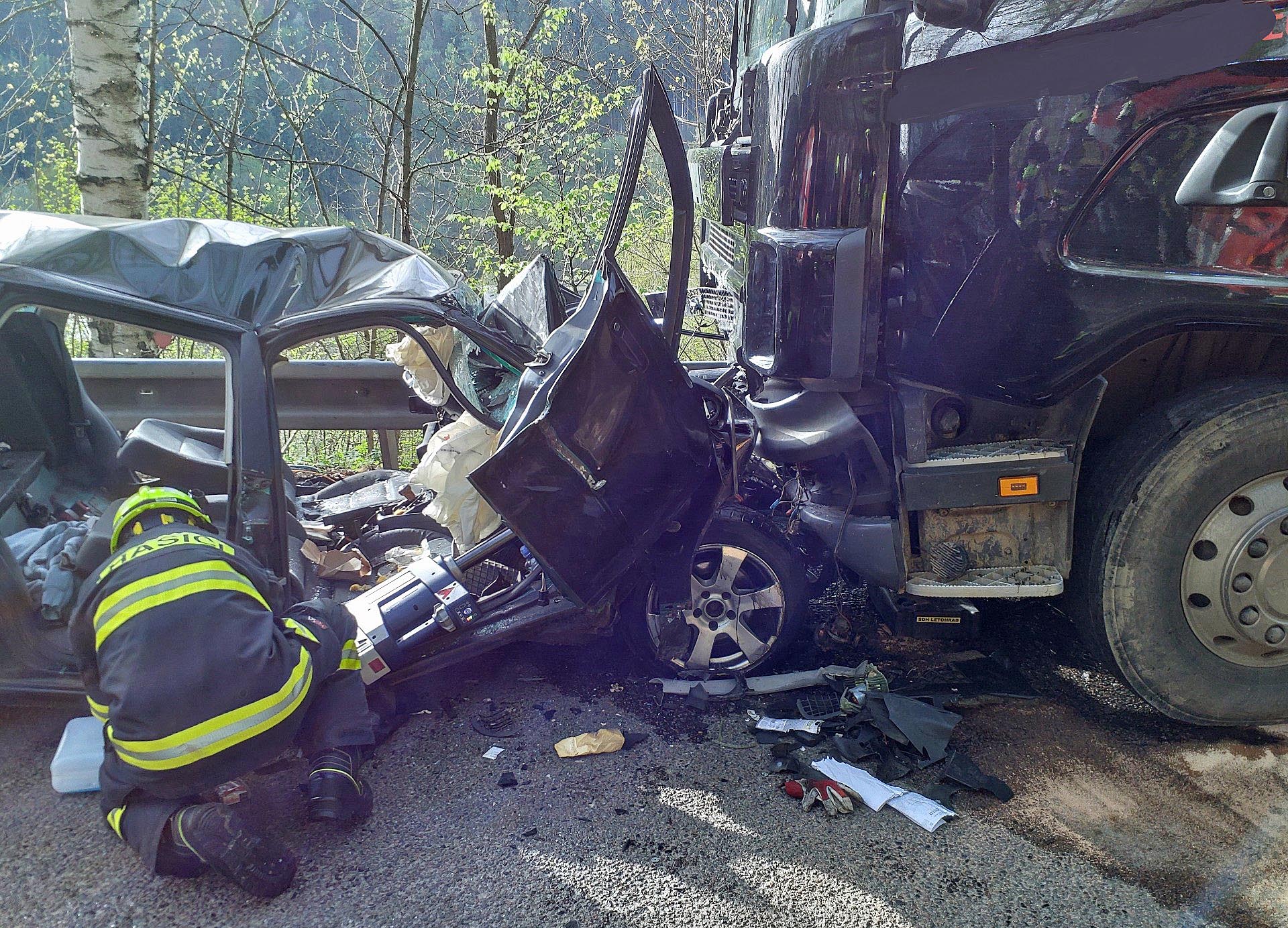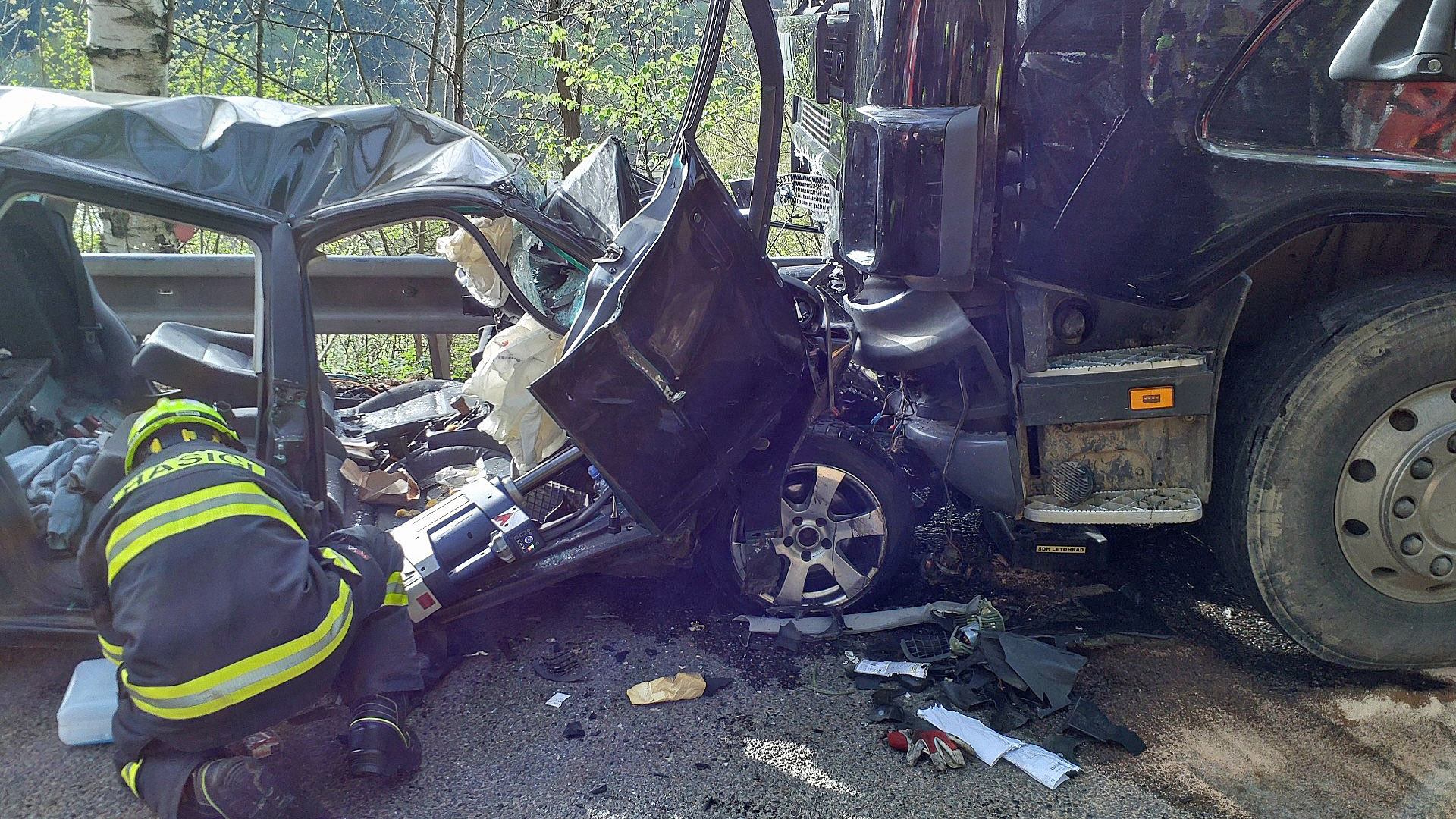 Mluvčí zasahujících hasičů Vendula Horáková uvedla, že osobní auto bylo zcela zdemolované. Hasiči z něj museli vyprostit zaklíněnou spolujezdkyni i řidiče. „Osobní vůz byl doslova zakousnutý pod nákladním automobilem. Hasiči si pomohli navijákem, kterým napasovaný osobní vůz dostali z pod nákladního automobilu. Hydraulické vyprošťovací zařízení jak profesionálních, tak dobrovolných hasičů bylo plně nasazeno,“ upřesnila Horáková.