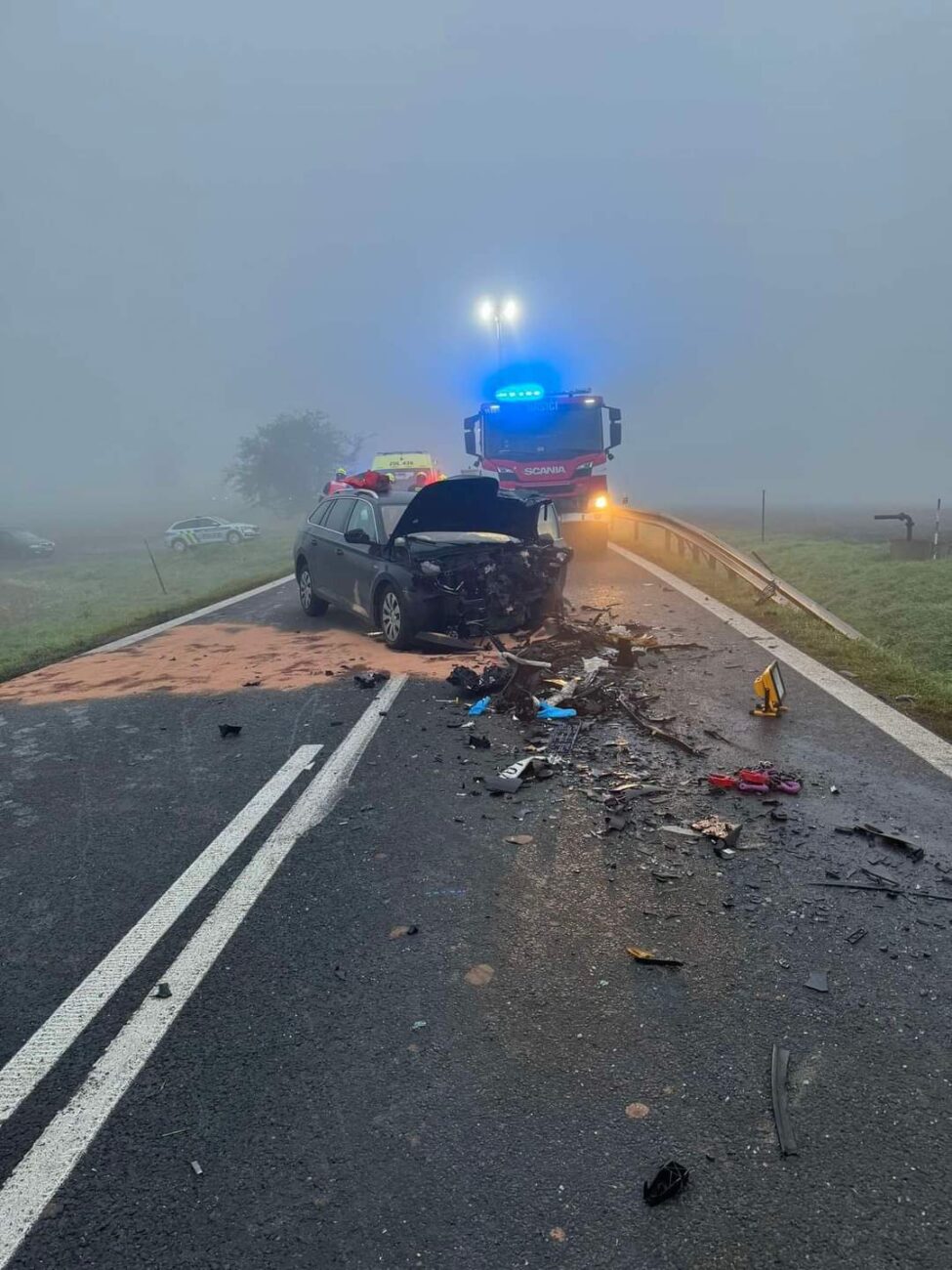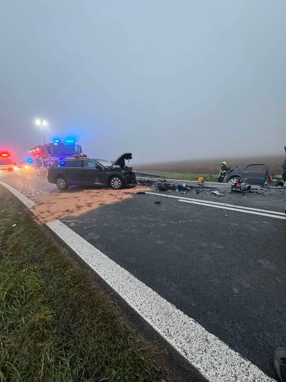 „Došlo tam k čelní srážce dvou vozidel, přičemž jedno skončilo mimo vozovku a druhé bylo převrácené na bok,“ sdělili zasahující policisté.