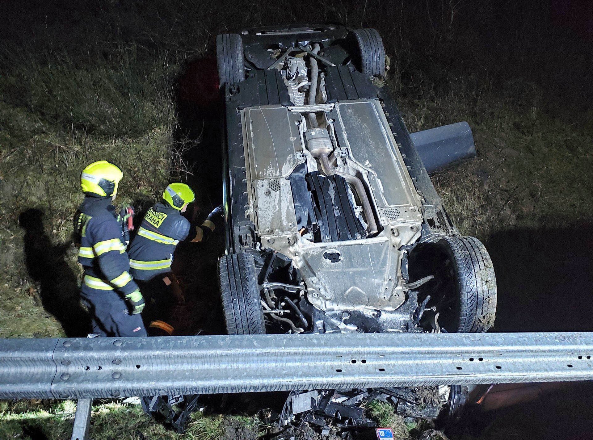 V jednom okamžiku narazil do svodidel a pak doslova nastala demolice svědčící o tom, že úplně pomalu nejel. Automobil zdemoloval asi 60 metrů svodidel a navrch ještě porazil lampu. Následně automobil skončil převrácený na střeše vedle silnice.
