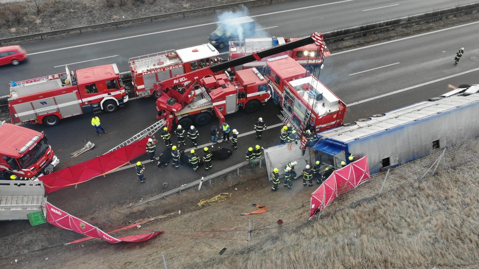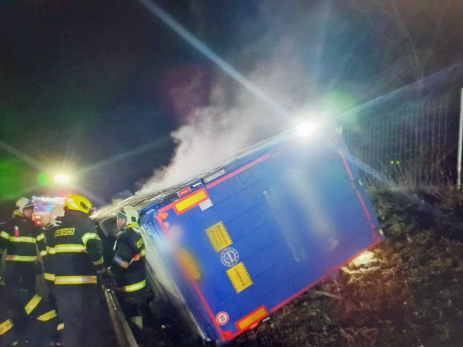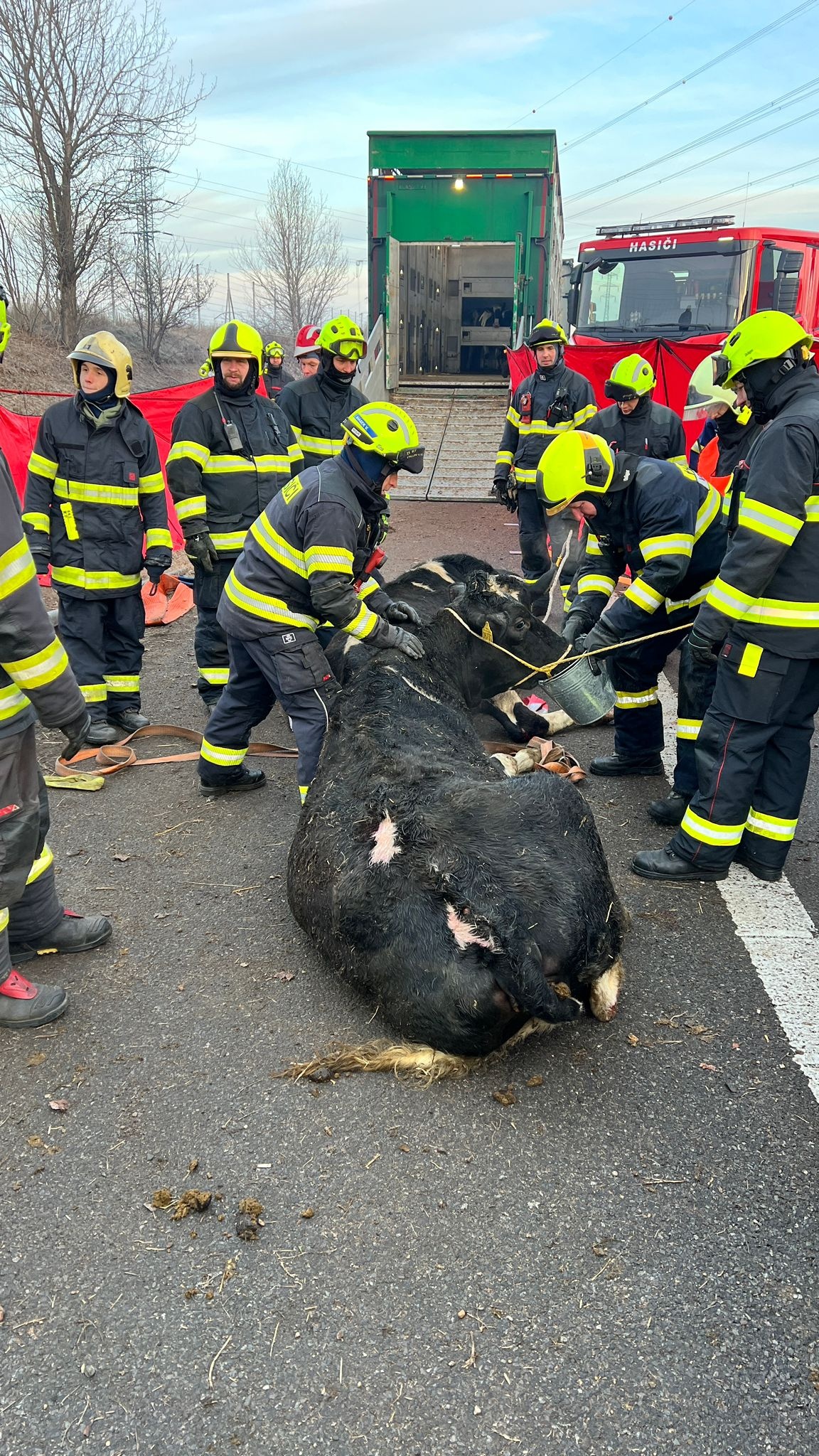 Po přistavení náhradního kamionu z Polska hasiči pomocí lan krávy postupně vytáhli z havarovaného návěsů a pomocí improvizované uličky vytvořené pomocí plachty a popruhů je dovedli do náhradního vozu.