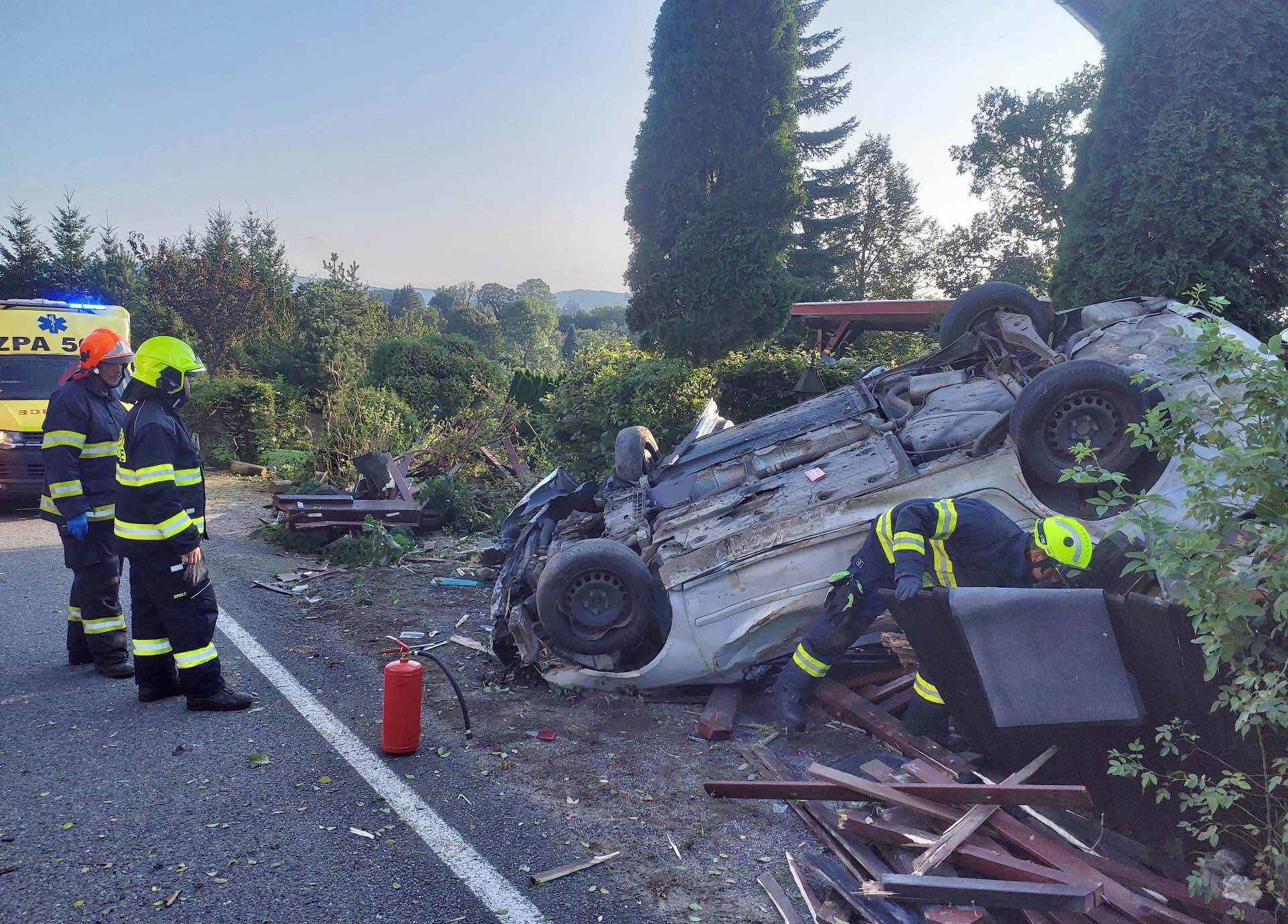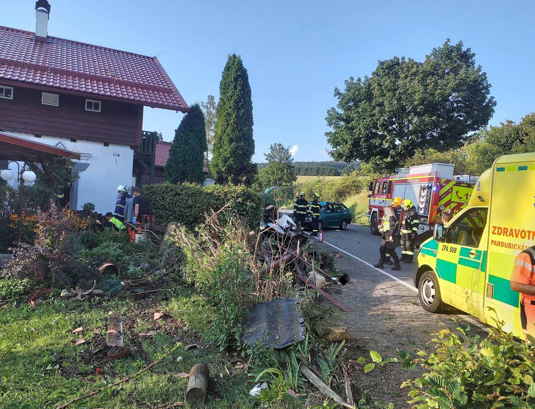 Vážná nehoda se stala v sobotu vpodvečer v obci Tatenice nedaleko Lanškrouna na Pardubicku. Osobní auto tam narazilo do zaparkované Felicie a následně vletělo na pozemek, kde skončilo na střeše.