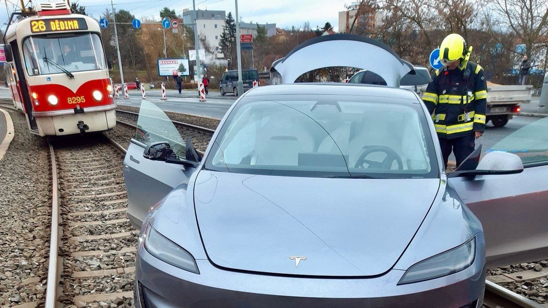 Více než půl hodiny blokoval provoz tramvají 22 a 26 elektromobil Tesla v pondělí dopoledne u OC Hostivař. Řidič si ale pochopitelně nechtěl hrát na tramvaj, ani nepředpokládal, že si pod trolejemi nabije auto, nýbrž podle policie dostal s vozem smyk a zastavil se právě až na kolejích.