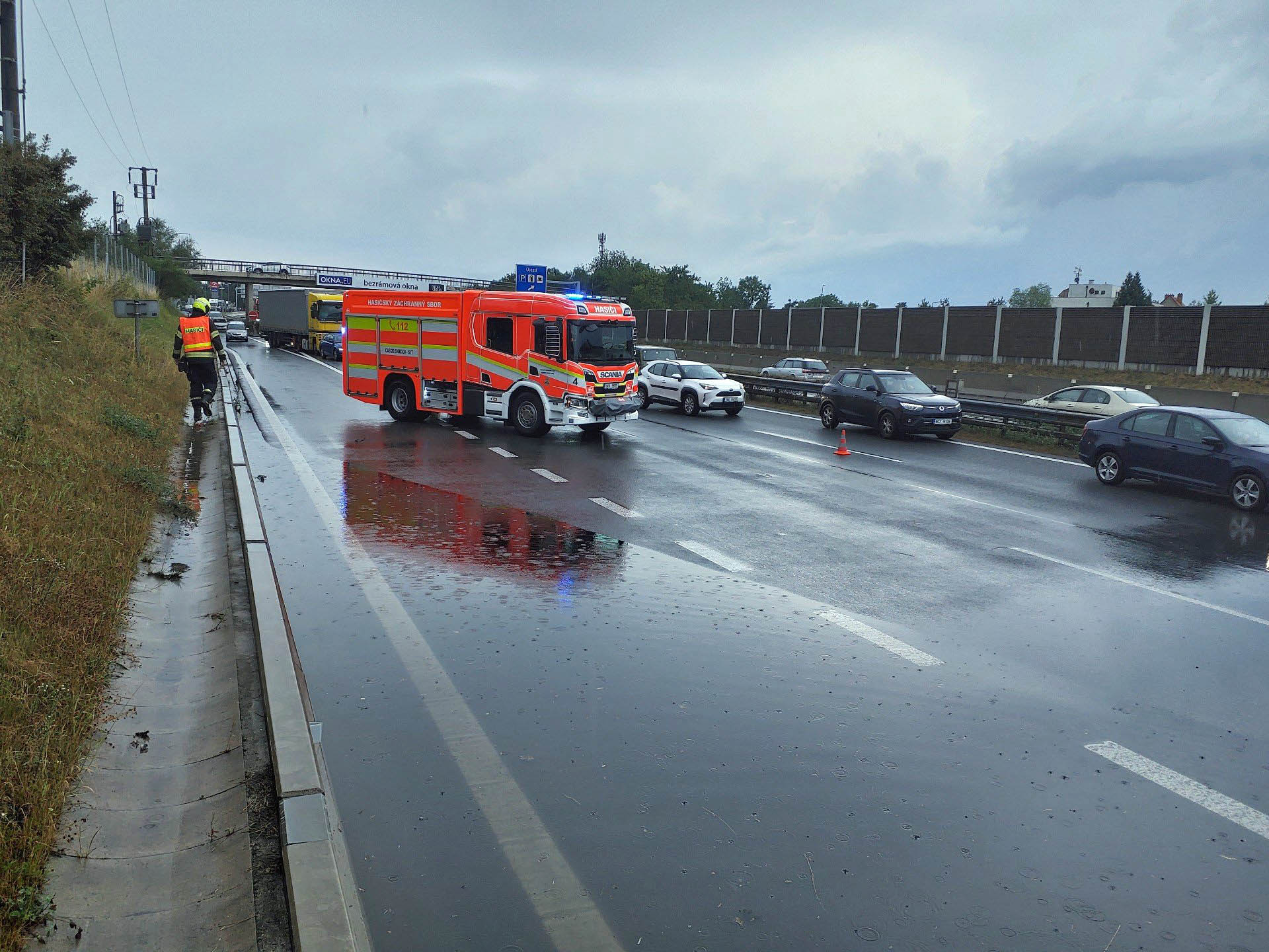 Velká laguna plná vody se vytvořila na dálnici D1 u Průhonic. Hasiči museli kolem půl šesté večer zastavit dopravu a snažili se vodu odčerpat. „Doprava v místě je silně omezena,“ uvedl mluvčí pražských hasičů Martin Kavka před 18. hodinou.
