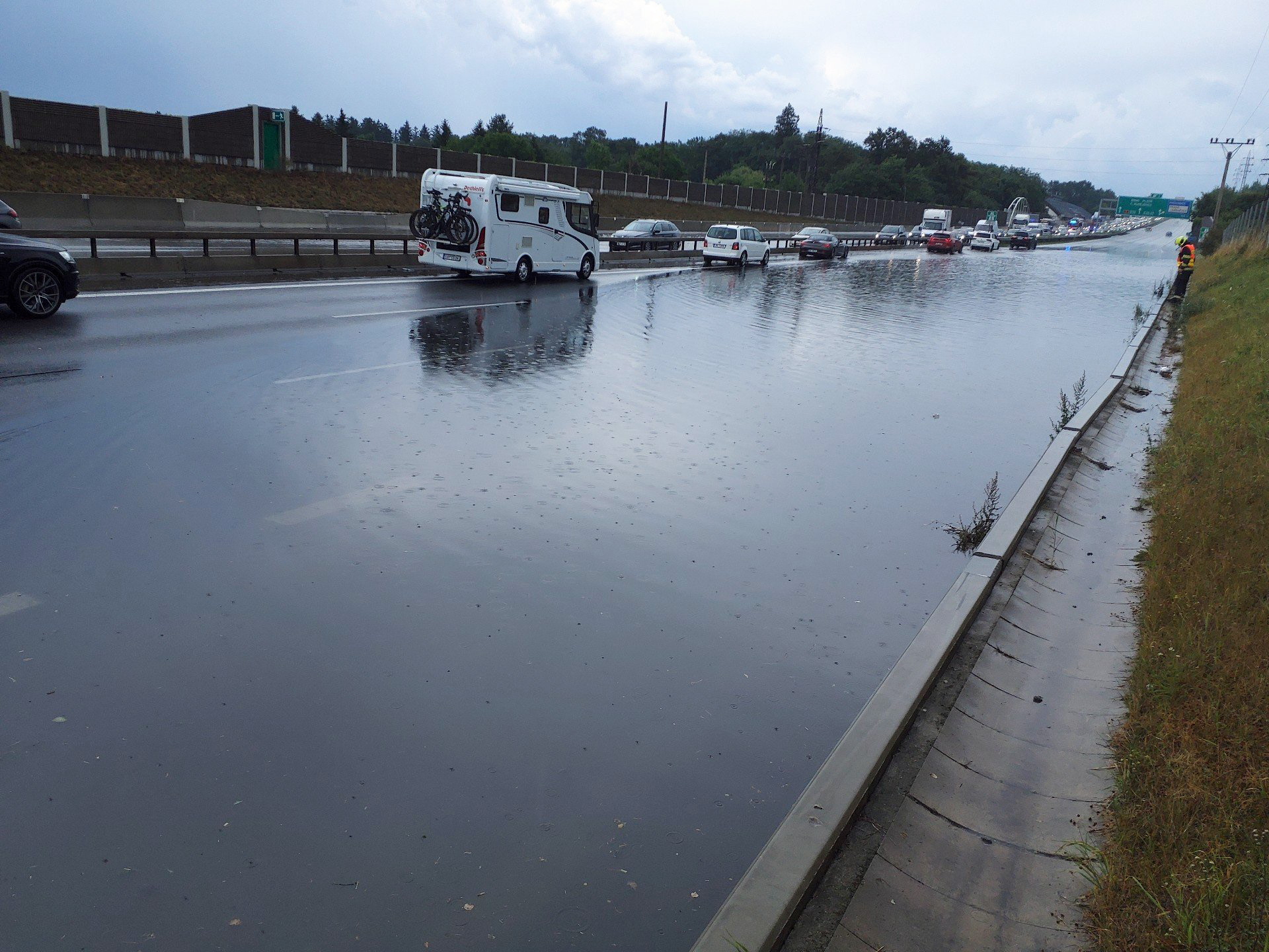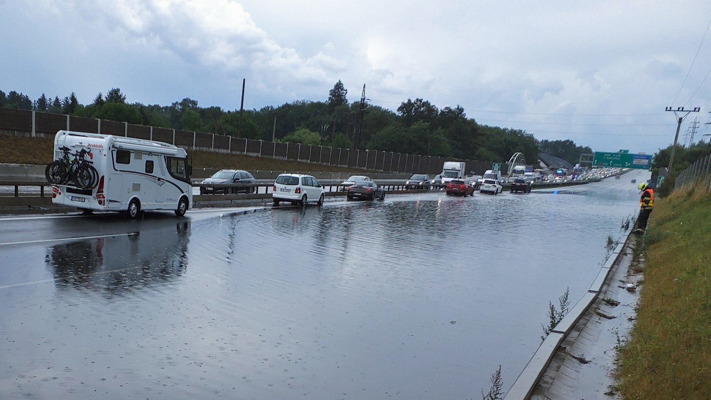Českem se ženou silné bouřky. V pátek v podvečer kvůli tomu musela být dokonce uzavřena dálnice D1 ve směru z Prahy na Brno. Přímo na dálnici D1 u Prahy nedaleko Průhonic se vytvořila velká laguna.