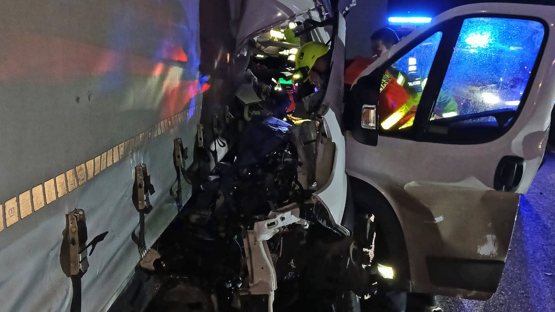 Zcela zničený předek dodávky, kabina karoserie naprosto nalisovaná do kamionu. Tak dopadla noční nehoda na dálnici D5 na zhruba 4. kilometru ve směru na Prahu. Řidič dodávky patrně nedobrzdil před kamionem a vrazil do jeho zadní části.