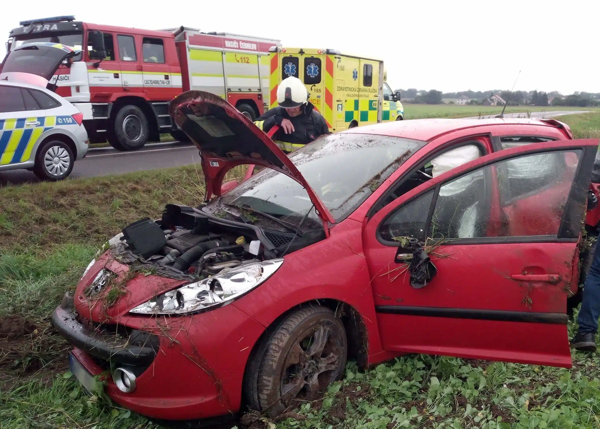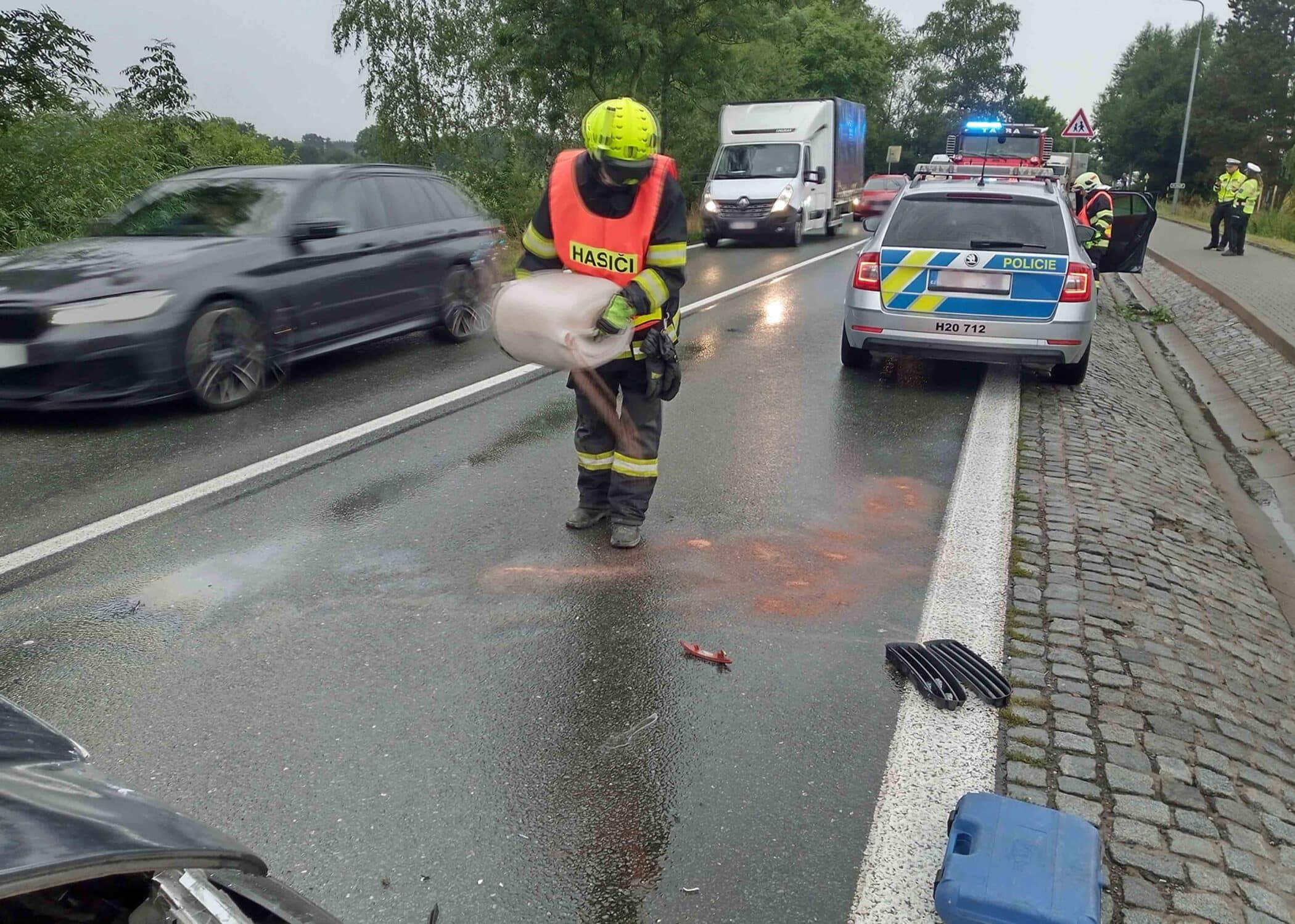 Hasiči u nehod zabezpečují vozidla proti požáru a likvidují úniky provozních kapalin. Naštěstí se zatím nejednalo o žádné vážné havárie či vážná zranění.