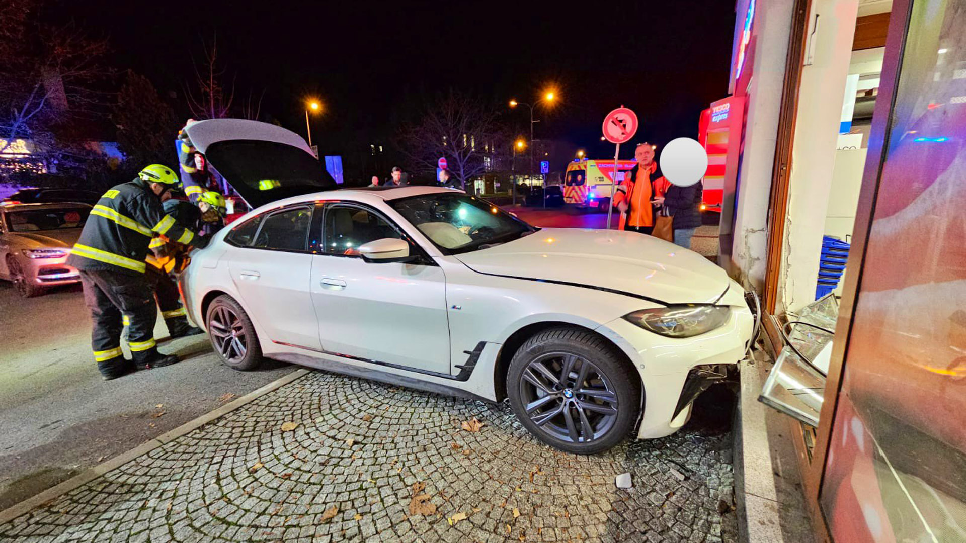 Nepříjemná nehoda se stala dnes večer v Dolních Břežanech nedaleko Prahy. 47letá řidička tam patrně nezvládla své elektro BMW a narazila s ním do výlohy supermarketu Tesco.