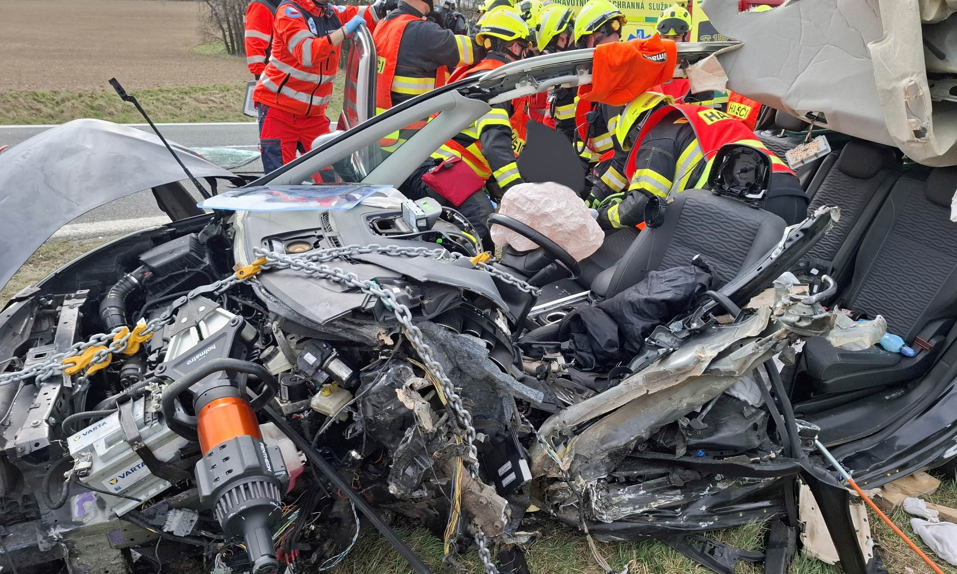 Po odstranění dveří i střechy hasiči řidičku na páteřní desce předali zdravotnickým záchranářům. Asistovali jim při transportu do vrtulníku, kterým byla následně přepravena do nemocnice.