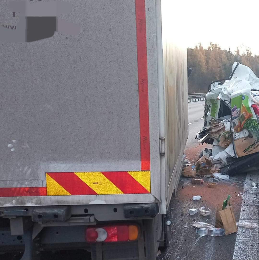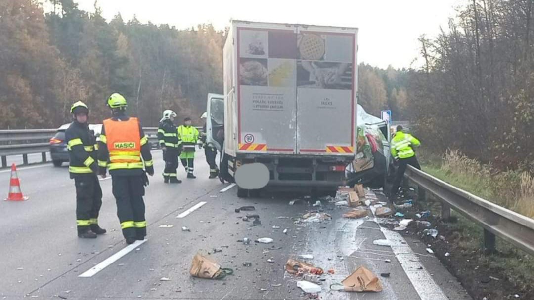 U dopravní nehody na dálnici D1 dnes ráno zasahovali profesionální hasiči z Benešova a dobrovolní hasiči ze Senohrab. Nákladní automobil tam ze zadu narazil do dodávky e-shopu potravin Rohlik.cz.