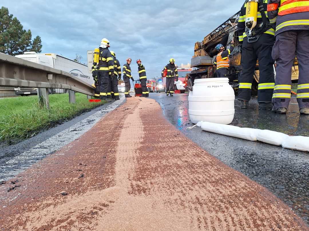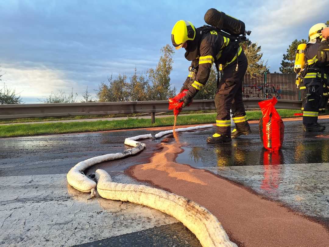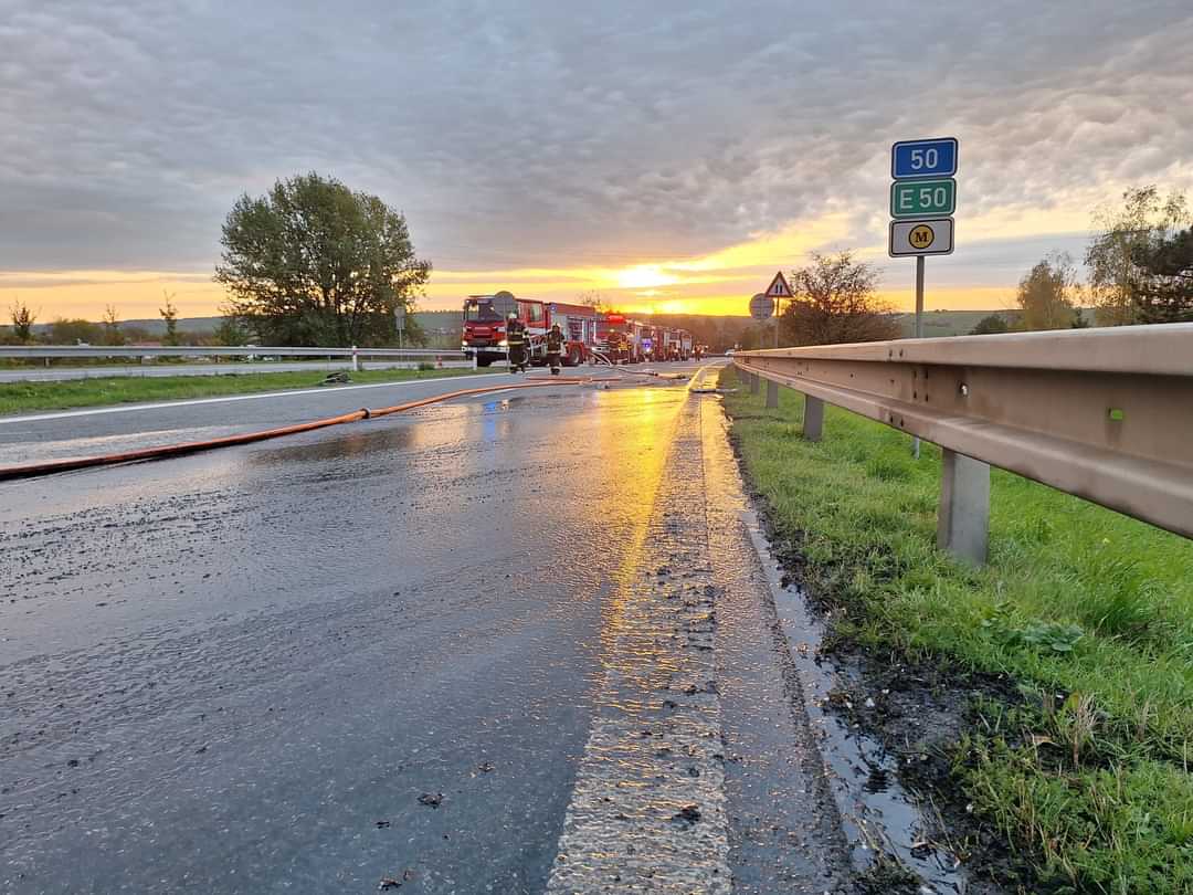 Autojeřáb začal na silnici I/50 hořet na úrovni obce Holubice v pátek po sedmé hodině ráno. Masivní plameny a černý kouř byly vidět i ze samotné dálnice D1. Když hasiči k místu nedaleko sjezdu z D1 přijížděli, jeřáb už byl plameny plně zasažen.