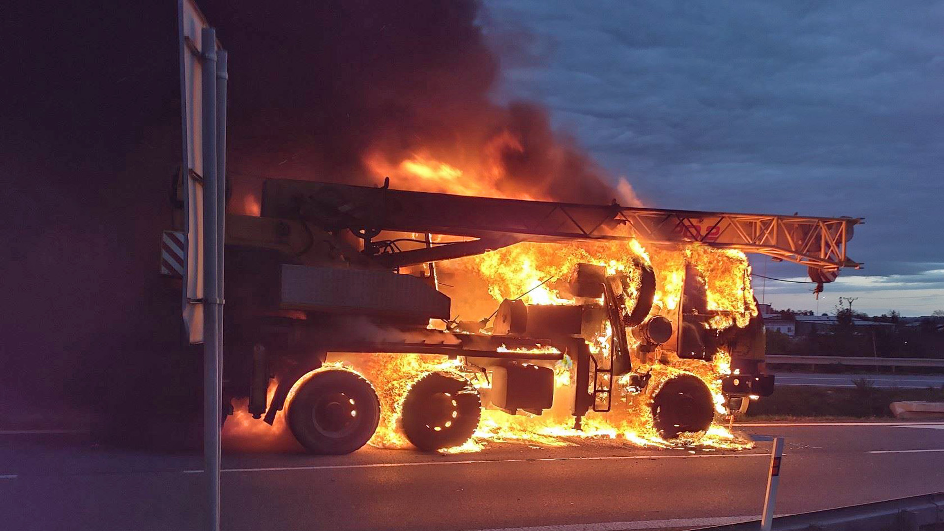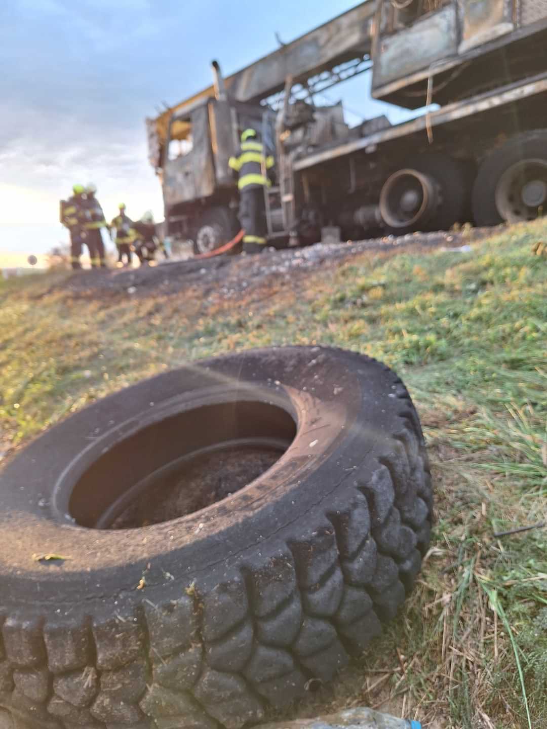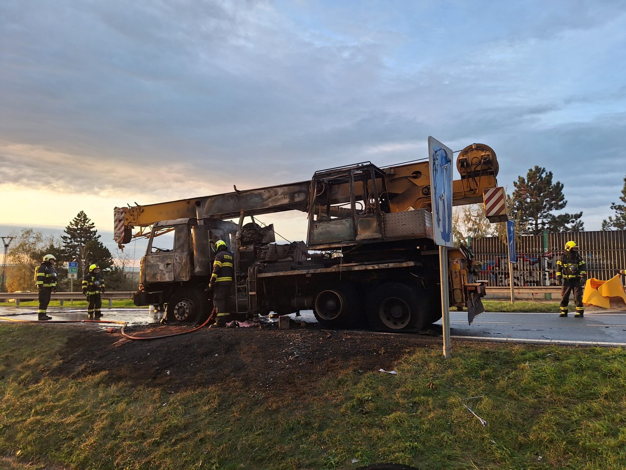 Autojeřáb začal na silnici I/50 hořet na úrovni obce Holubice v pátek po sedmé hodině ráno. Masivní plameny a černý kouř byly vidět i ze samotné dálnice D1. Když hasiči k místu nedaleko sjezdu z D1 přijížděli, jeřáb už byl plameny plně zasažen.