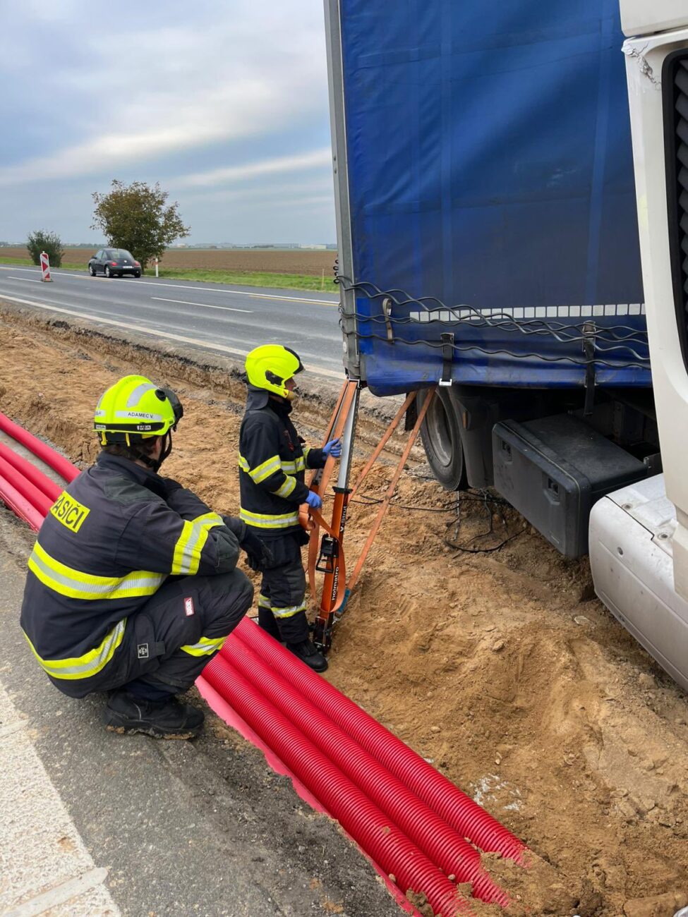 Silničáři tam instalují váhy na kamiony a právě v tomto místě se v pátek dopoledne kamion kabinou doslova zapíchl do výkopu ve středovém pásu, kde se pokládá kabeláž.
