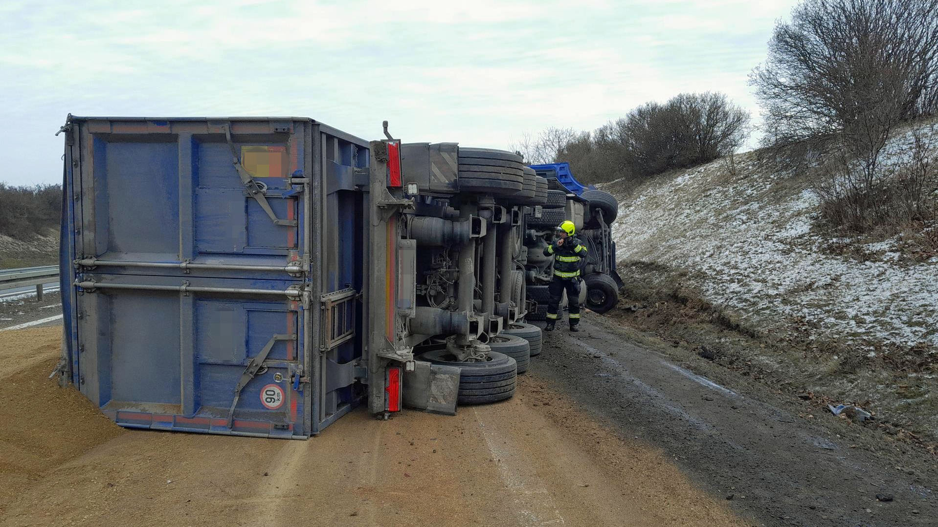 Havárie se stala na 15. kilometru dálnice D7 u Brandýsku, kde kolem 11. hodiny řidič převrátil nákladní vůz naložený sypkým štěrkovým šrotem. Náklaďák zablokoval pravý jízdní pruh a kabinou se zabořil do svahu u dálnice. Do obuo pruhů a částečně i do protisměru se pak vysypal sypký materiál.