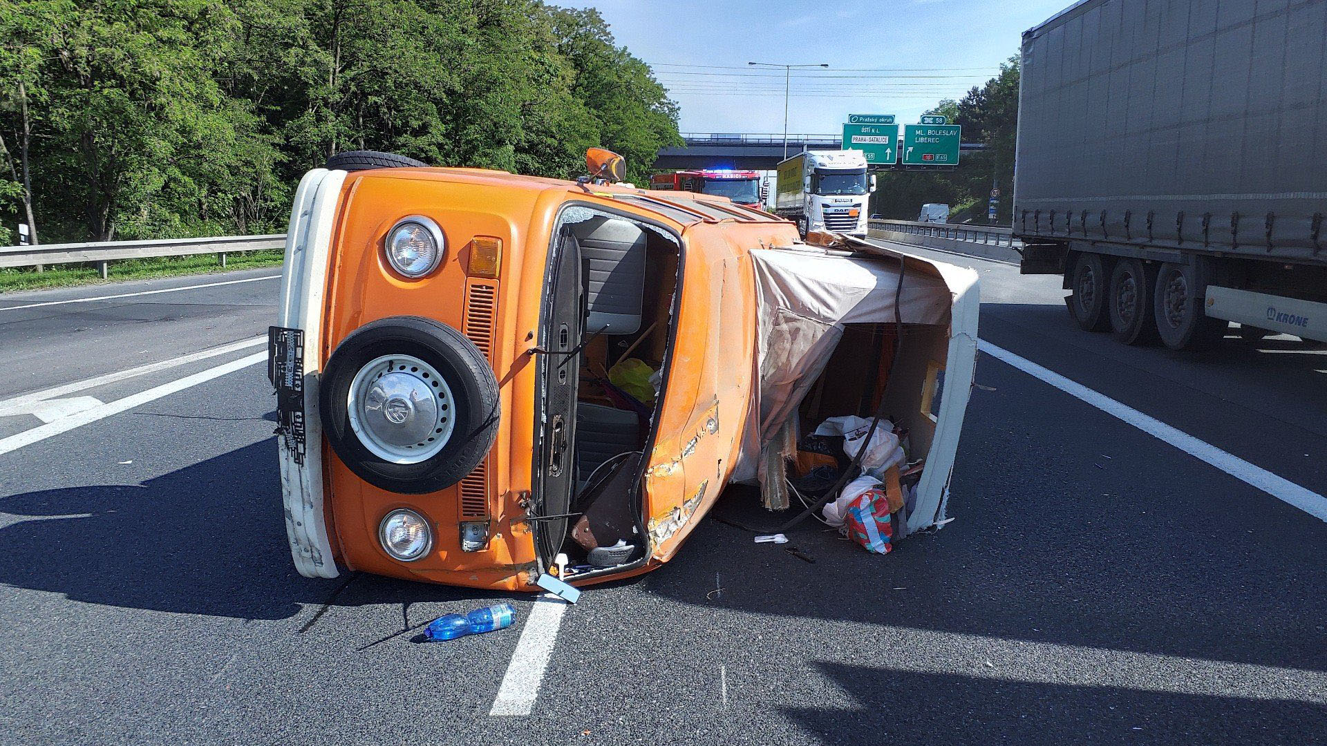 Legendární oranžový van Volkswagen Transporter 2 Camper se zvedací střechou převrácený na boku na Pražském okruhu. Tak bohužel skončila nehoda, která se stala v pondělí dopoledne v místě zúžení u sjezdu na Černý Most. Vůz skončil převrácený zřejmě po kolizi s kamionem.