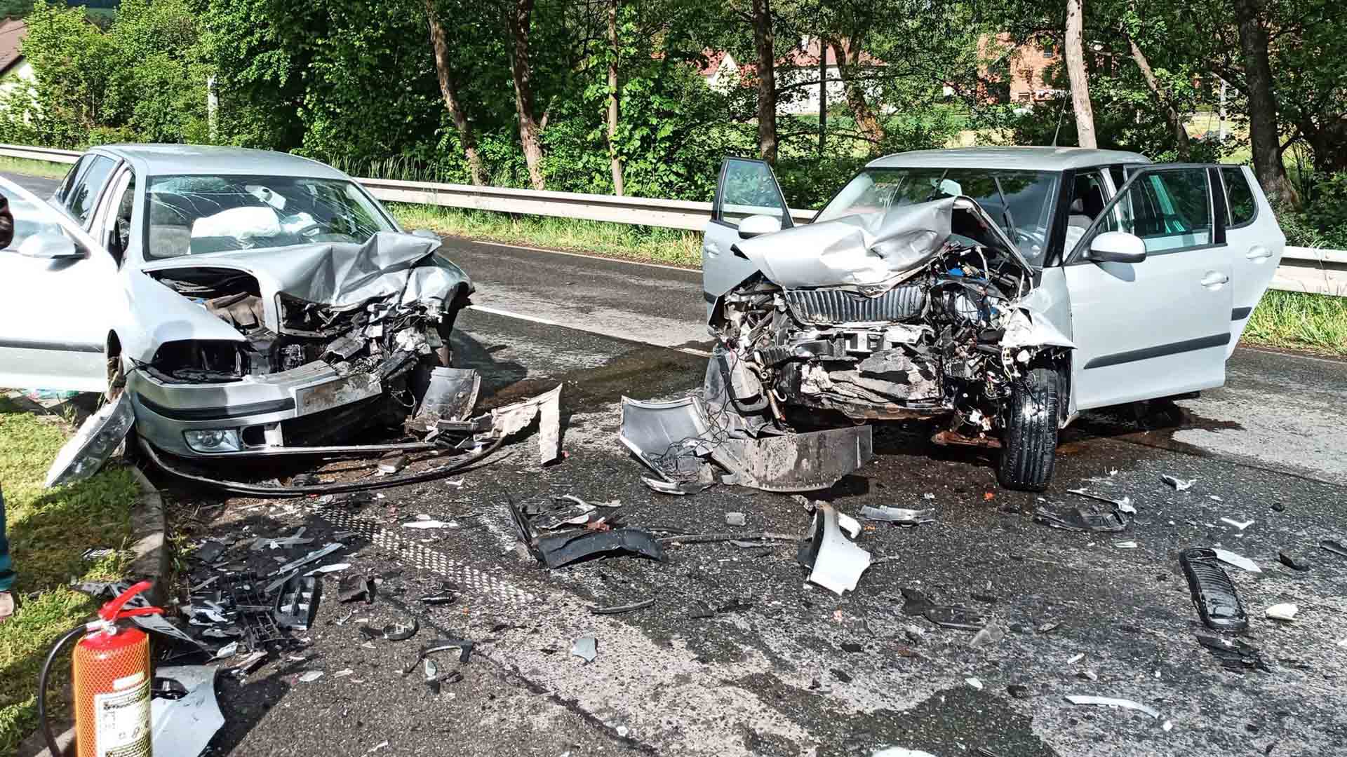 Na odpis skončily dva vozy značky Škoda po celkem drtivé čelní srážce v neděli v Polichnu, místní části lázeňského města Luhačovice. Při nehodě se zranili čtyři lidé, v autě byly i dvě děti.