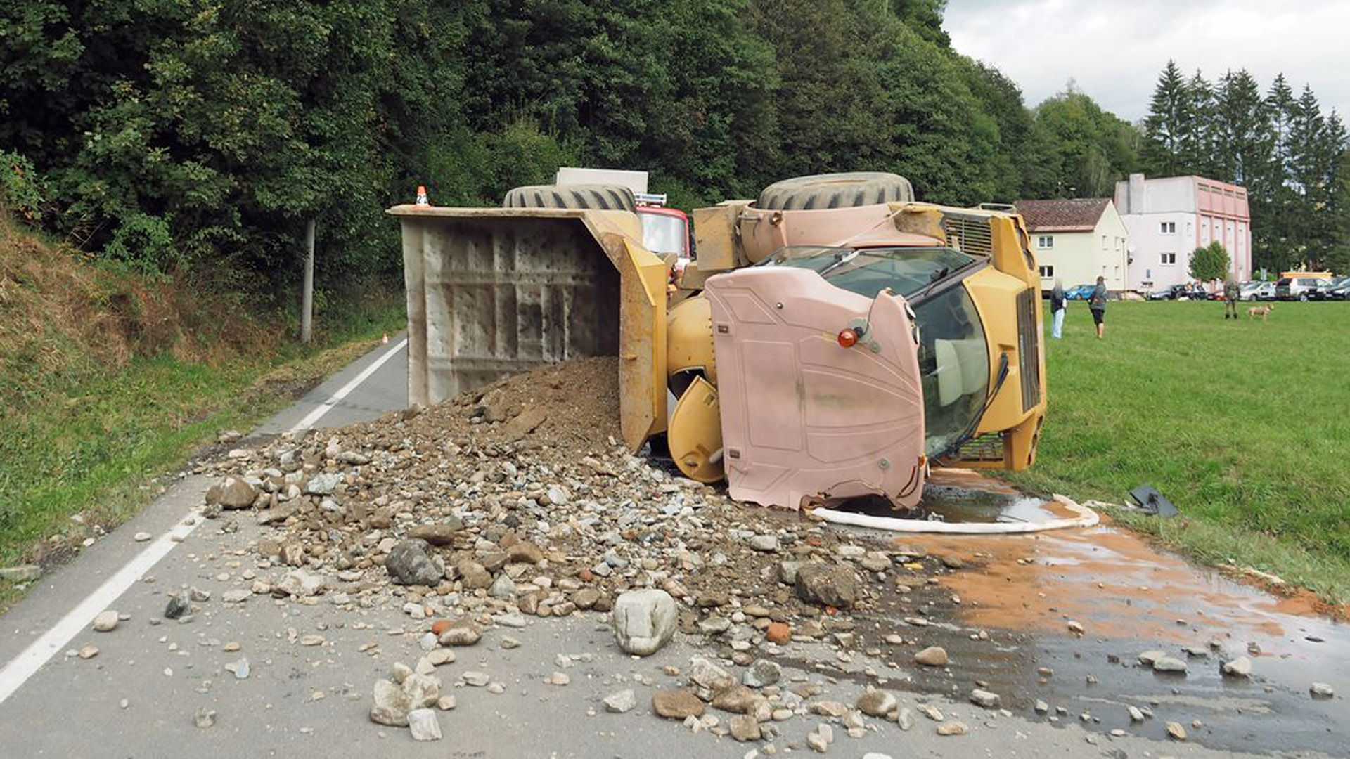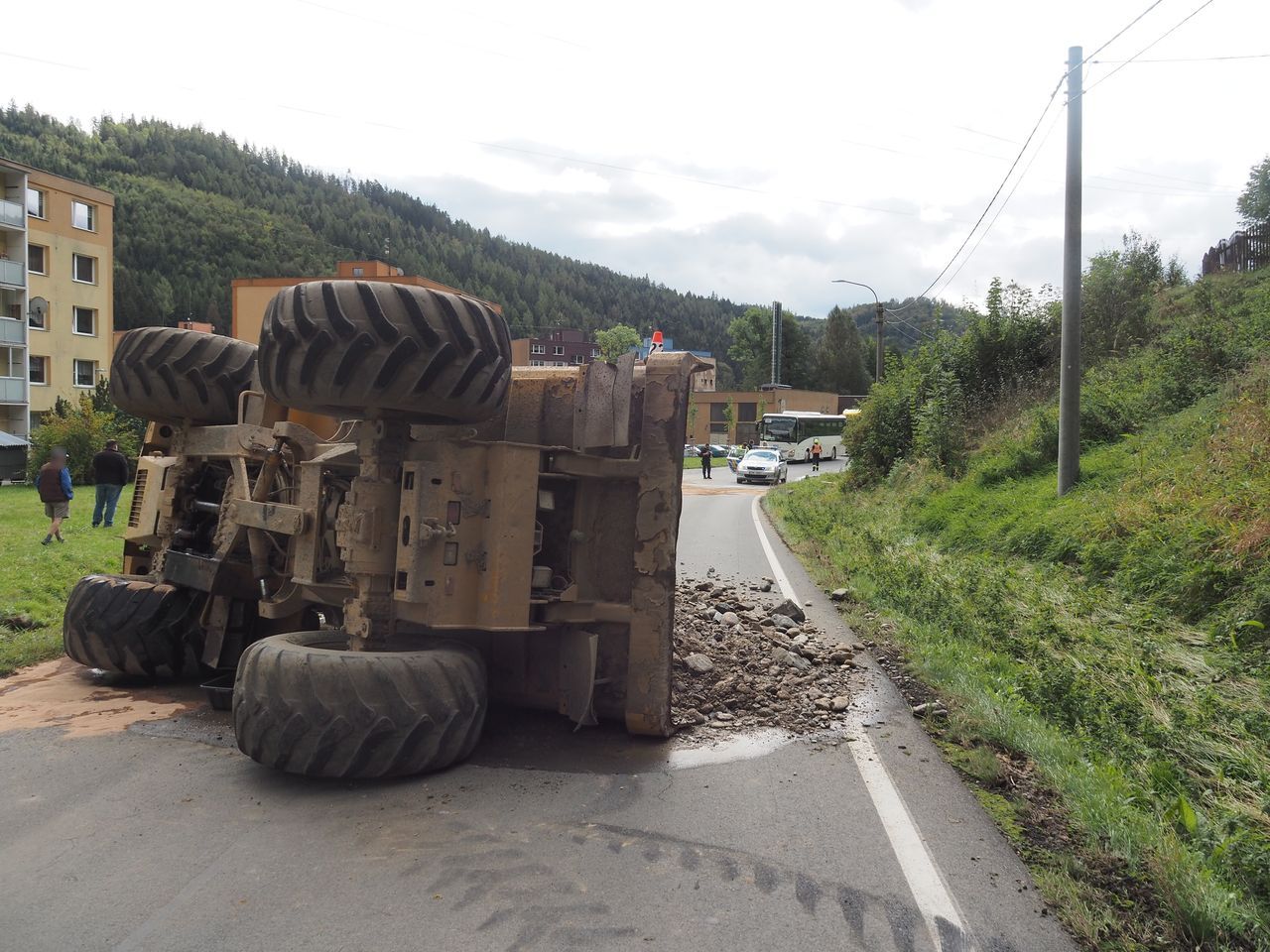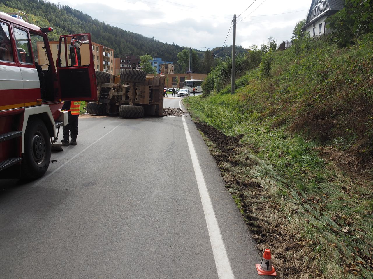„Přitom se pod váhou stroje krajnice utrhla, muž strhl řízení vlevo, a po vyjetí na silnici se vůz převrátil na pravý bok a náklad rozsypal na cestu,“ uvedla policejní mluvčí Miluše Zajícová.