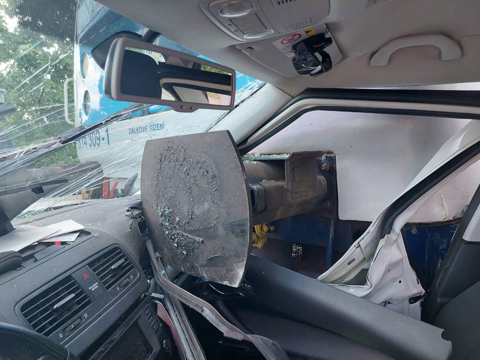 Fotografie mluví za vše. Ne příliš častý obrázek ukazuje, jak to vypadá zvnitřku auta, do něho vrazil vlak. Hrozivě vypadají především nárazníky, které auto prorazí jako konzervu. Cestujícího uvnitř mohou zle poranit.