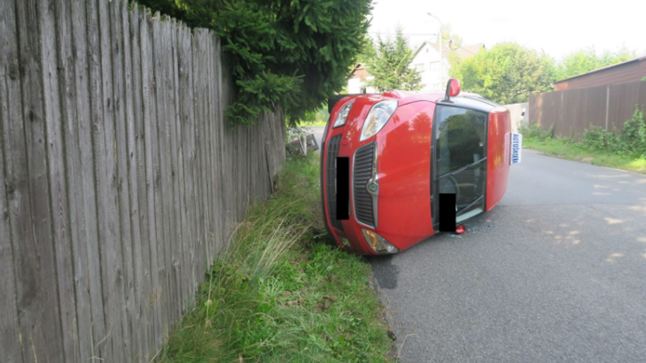FOTO: Řidič autoškoly nezvládl řízení, porazil značku, plot a překlopil Fabii na bok