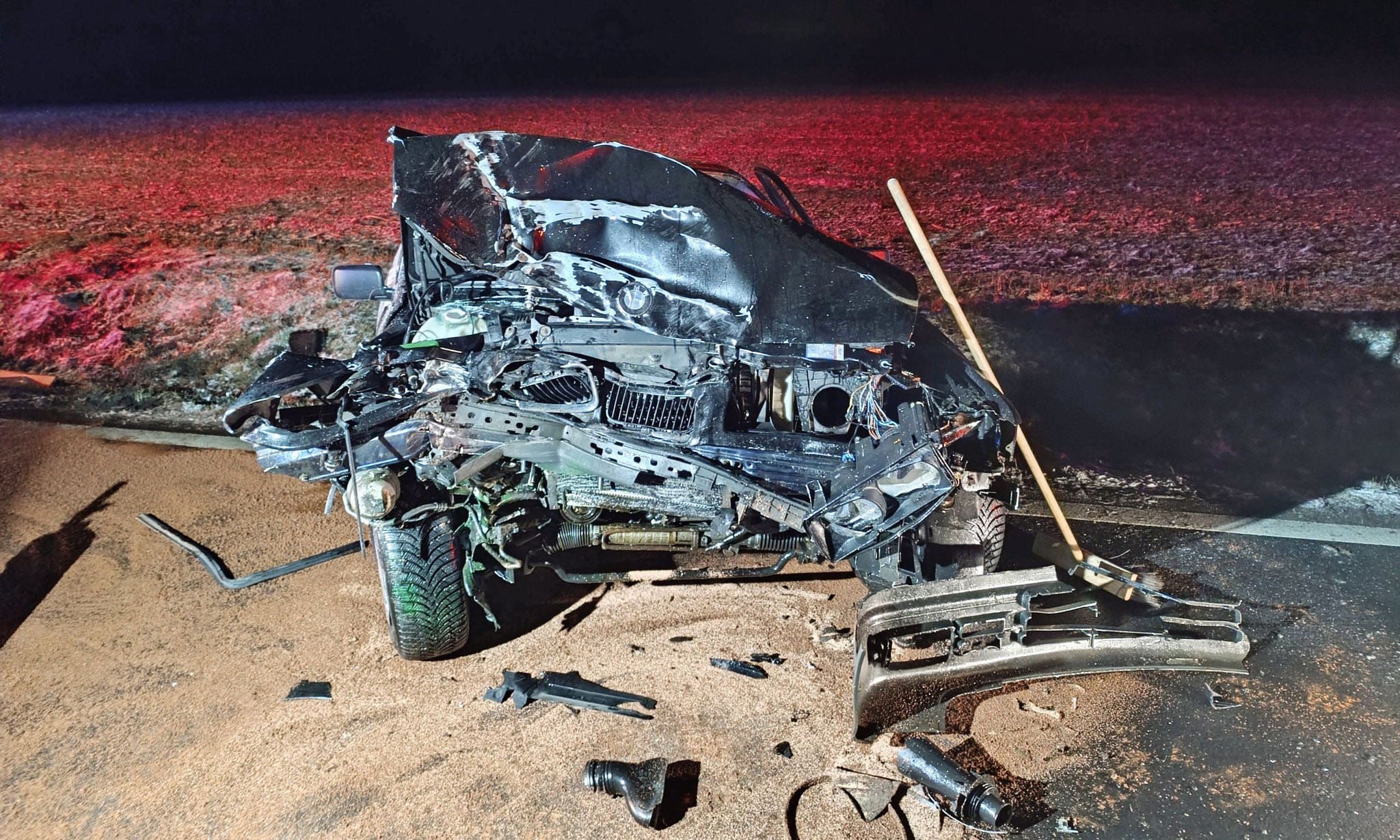 Zcela zdemolovaná přední část karoserie. Tak skončil postarší osobní vůz BMW po včerejší noční dopravní nehodě na Tachovsku. Na silnici z Boru na obec Stráž dostal 19letý řidič s vozem zřejmě smyk, vyjel mimo silnici a narazil do mohutného stromu.