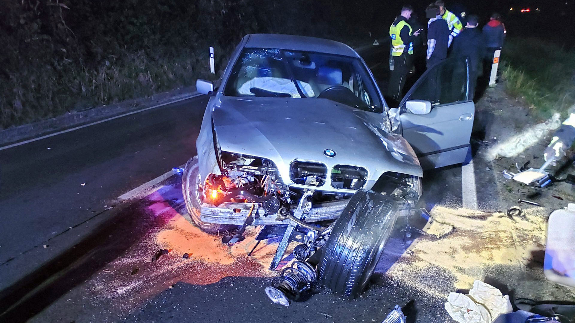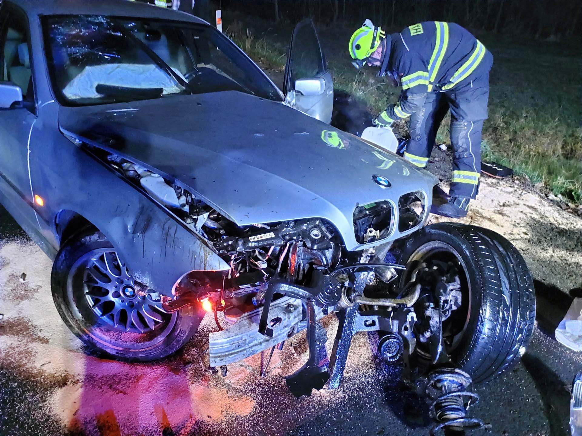 Postarší BMW s rozmláceným podvozkem, vylomeným kolem i pobořenou kapotou. Tak skončila nedělní večerní nehoda v Kerharticích na Orlickoústecku. Řidič tam s autem udělal salto přes střechu.