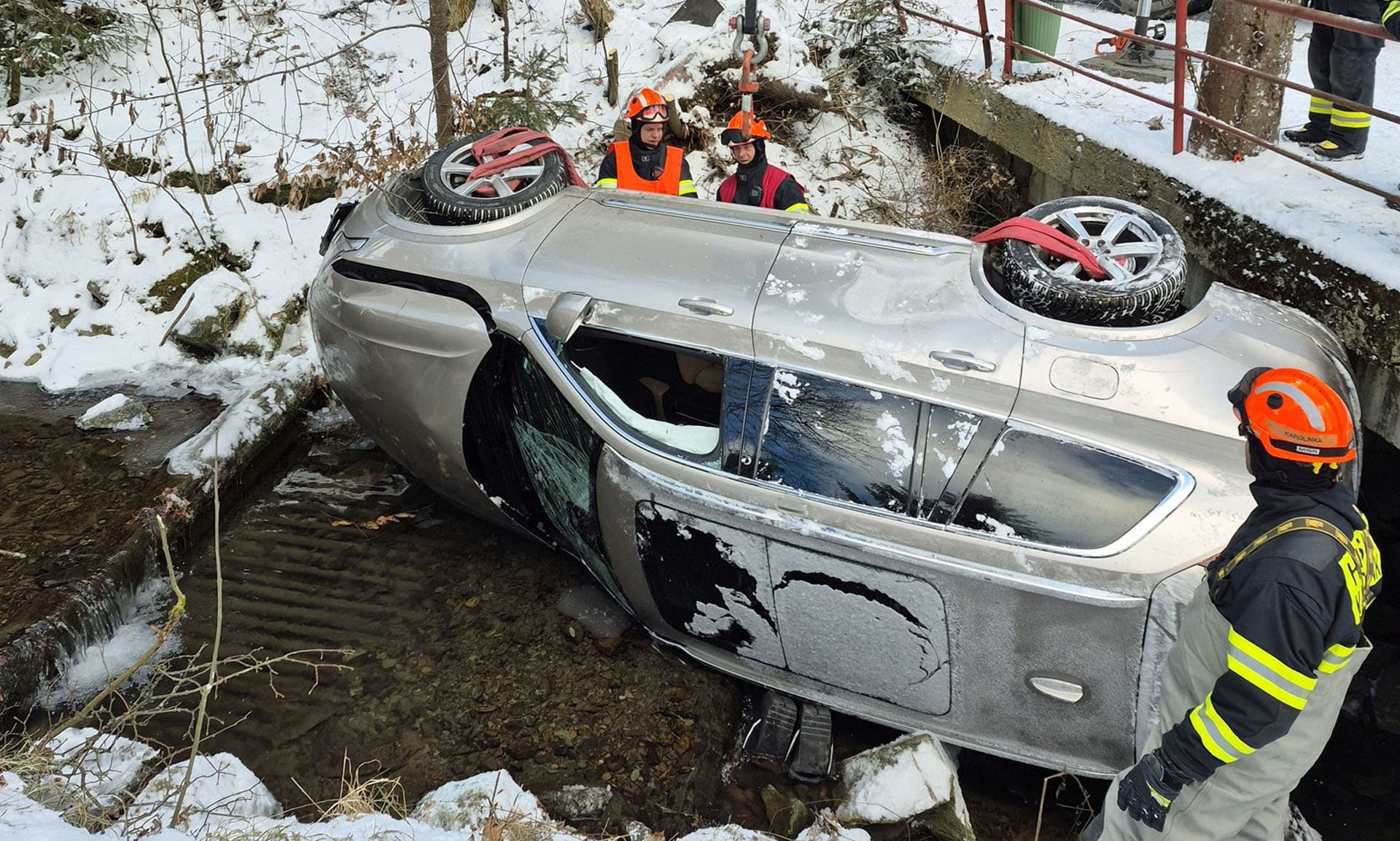 Foto: Řidička se s Volvem zřítila ve Velkých Karlovicích do potoka