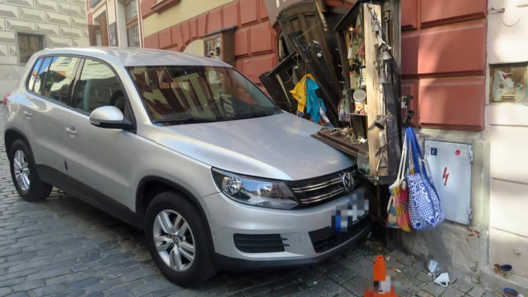 V historickém centru Českého Krumlova najelo osobní auto do výlohy obchodu se suvenýry. Podle policie v autě nikdo nebyl, bylo špatně zabrzděné a rozjelo se samo.