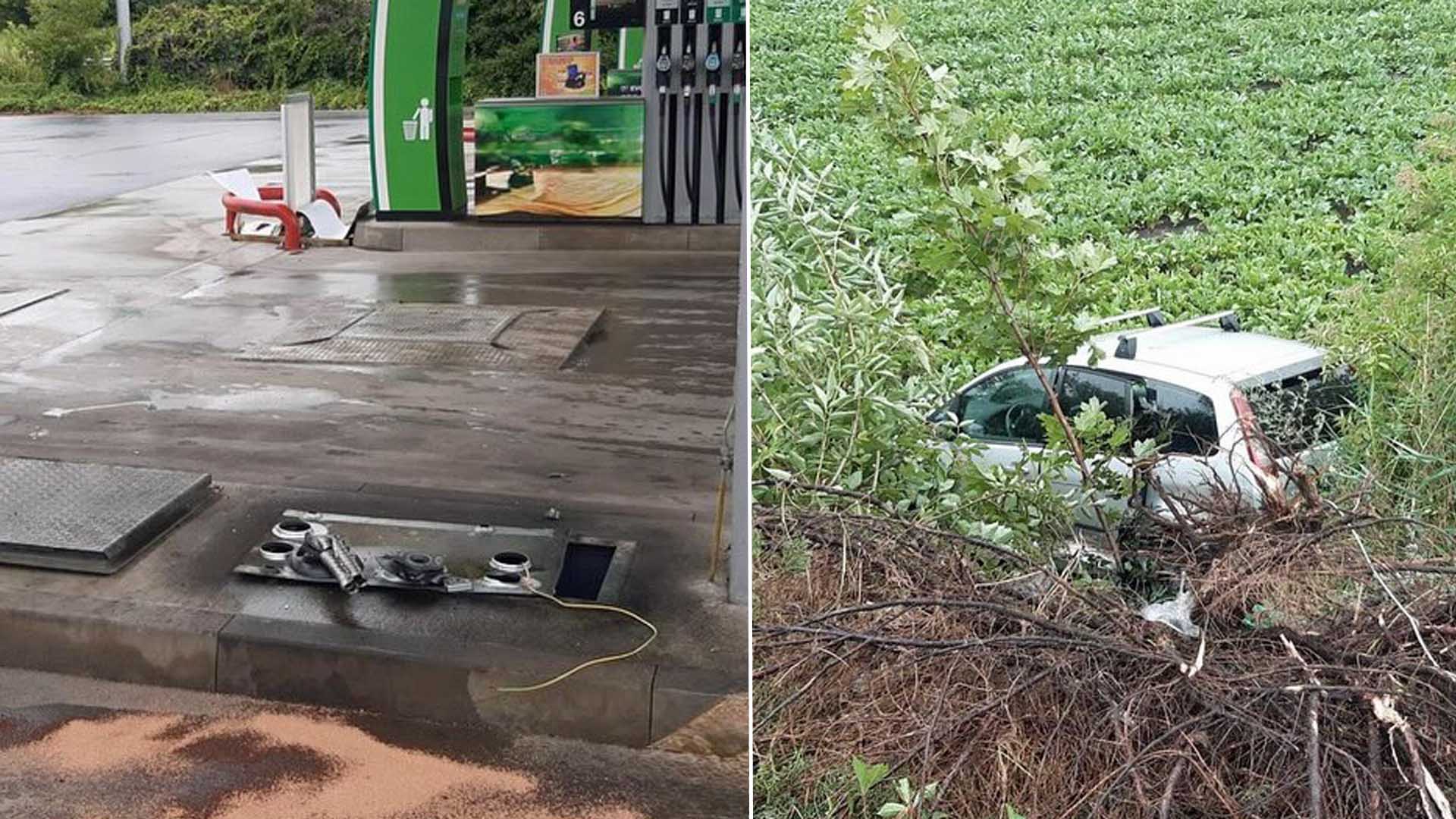 Na čerpací stanici po stojanu zůstaly jen otvory od potrubí. Samotné auto pak pokračovalo v jízdě, sjelo do pole a skončilo rovněž v poli několik metrů od čerpací stanice.