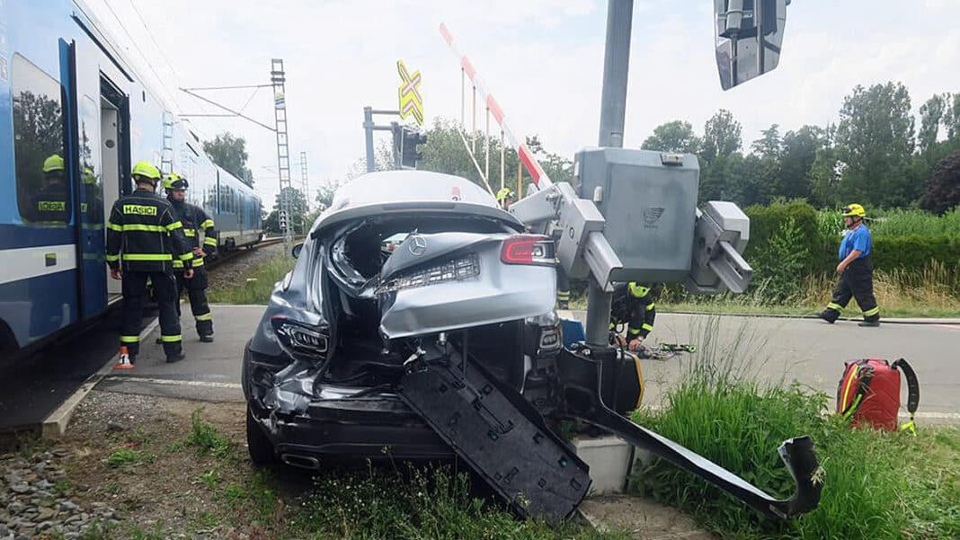 „Jenže nákladní vozidlo po přejetí přejezdu zastavilo kvůli probíhajícím pracím na komunikaci, kde je provoz řízen kyvadlově semaforem. Řidič Mercedesu zastavil tedy za ním přímo na přejezdu,“ vysvětluje mluvčí policie Miluše Zajícová.