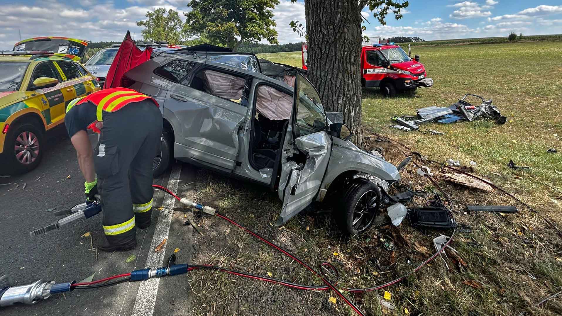 V přední části rozdrcený a rozříznutý o vzrostlý strom skončil vůz Škoda Karoq, s nímž dnes odpoledne havaroval 45letý řidič na silnici II/137 mezi obcemi Malšice a Slapy na Táborsku. Při nárazu to byla taková rána, že autu odletělo kolo i s tlumičem na přilehlé pole.