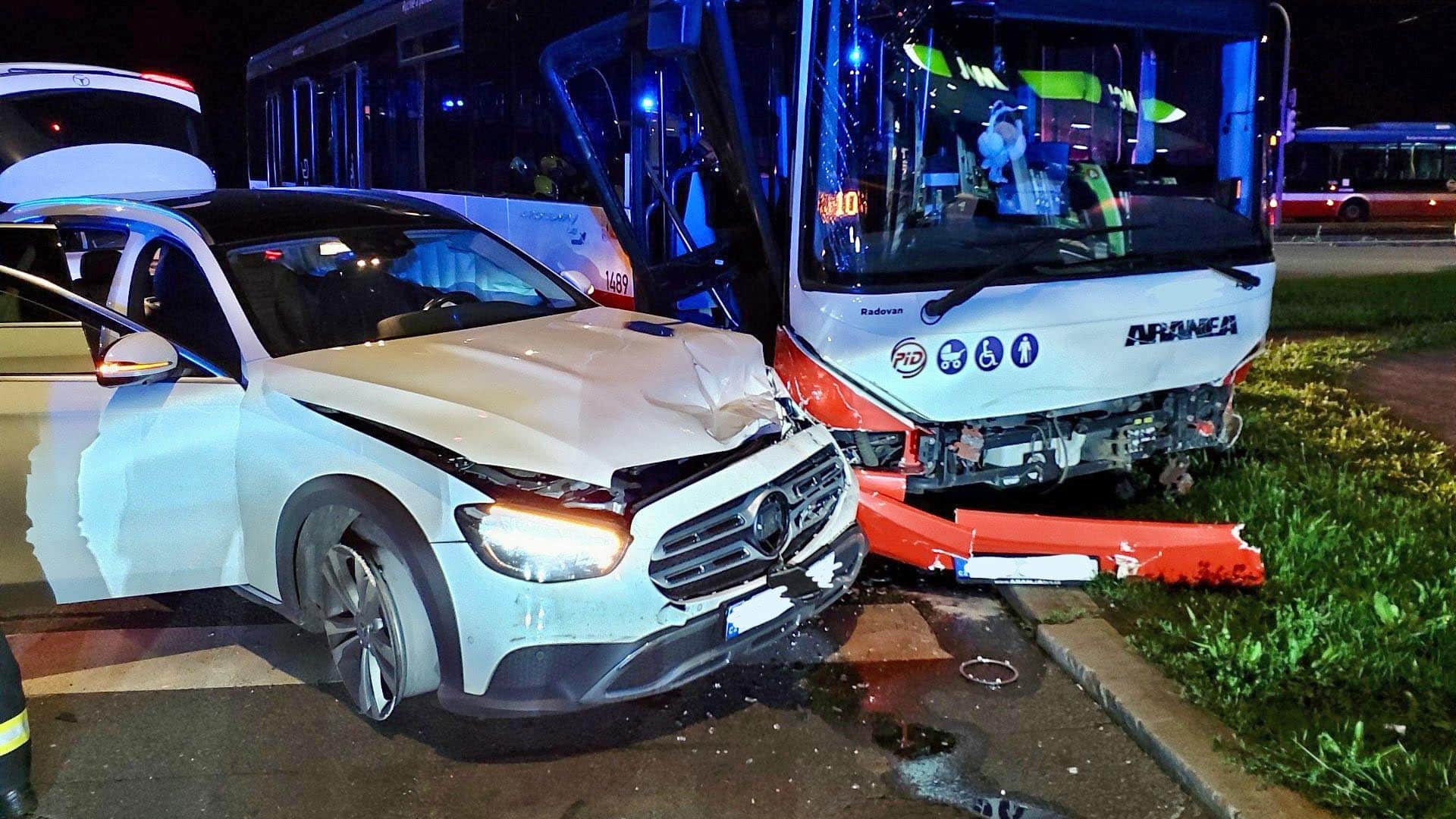 FOTO: V Malešicích se i přes slabý noční provoz srazil autobus a tři auta, čtyři zranění