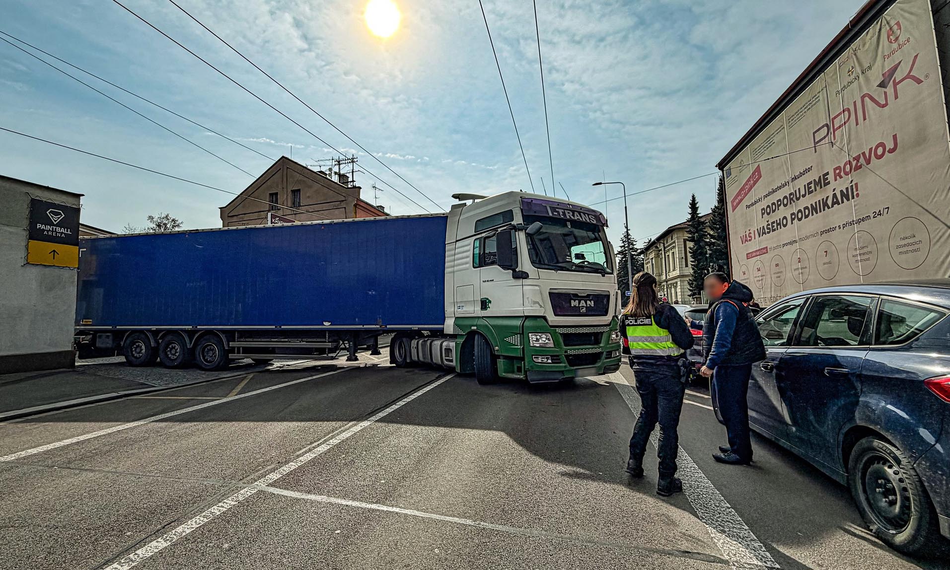 Jenže couvání s návěsem, navíc značně zatíženým, to už je přece jen vyšší řidičská disciplína. Kamion ztratil vzduch a zůstal trčet z vrátnice napříč celou ulicí. A doprava v Pardubicích začala tak trochu připomínat situaci v Hromuzském průlivu.