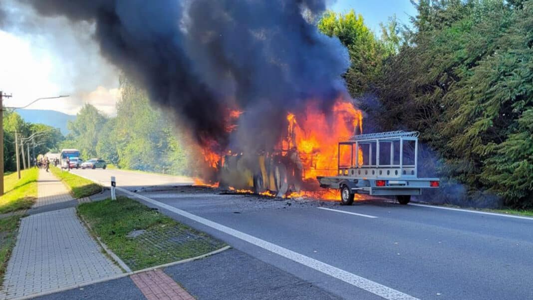 Za dramatických okolností dnes skončila jízda autobusu v obci Ropice na Frýdecko-Místecku. Za jízdy tam začal hořet autobus, který následně plameny zcela zničili. Cestující stihli včas utéct.