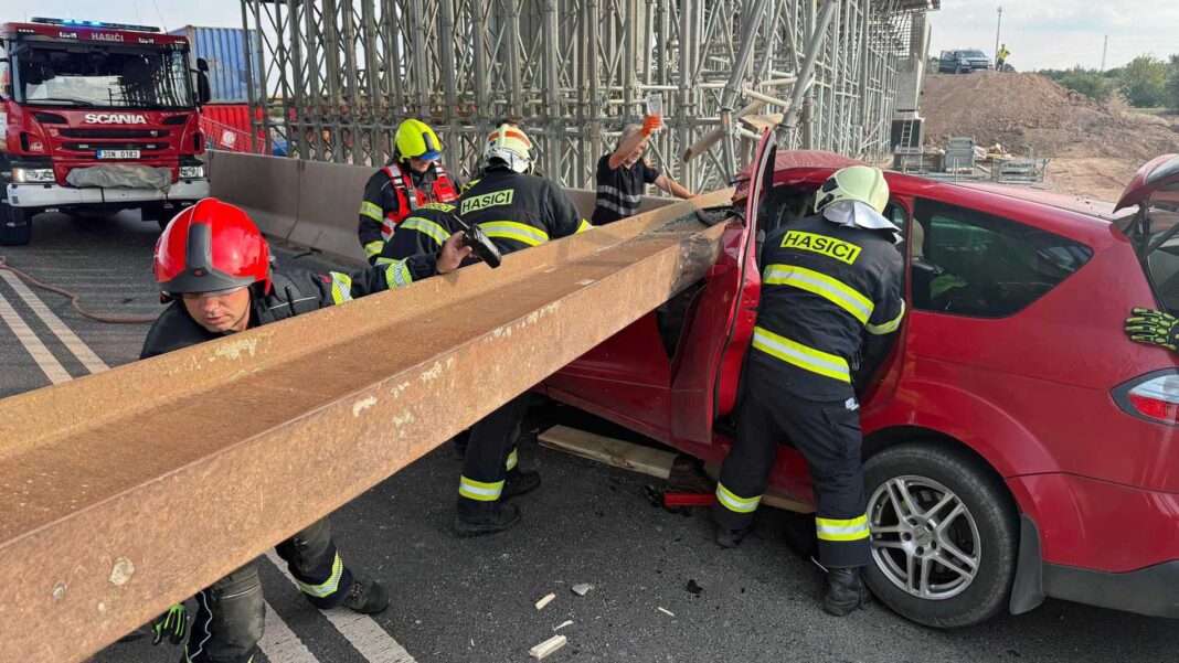Šílená nehoda se stala dnes večer v Třebízi na Kladensku! Na osobní auto se tam zřítila těžká kovová traverza. Vůz zcela zdemolovala, uvnitř vozu byli dva lidé, jeden je vážně zraněný.
