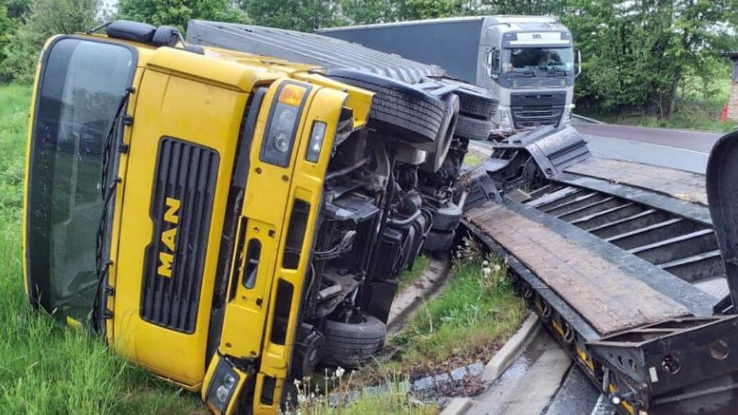 Kola podvalu, který převážel skutečně těžký náklad v podobě jiného kamionu, se svezla v zatáčce v Albrechticích do odvodňovacího žlabu, podval se naklonil a převážený kamion zřítil vedle silnice na trávník. Silnice musela být v pátek dopoledne na několik hodin zcela uzavřena.