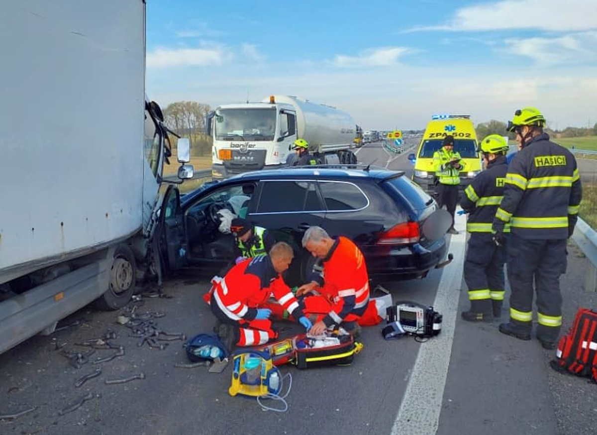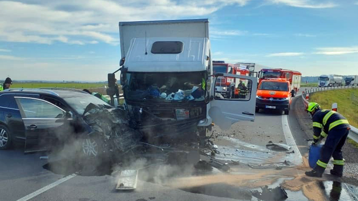 Nehoda nákladního a osobního auta zablokovala na několik hodin úsek D35 poblíž obce Ostrov nedaleko Vysokého Mýta. Žena z osobního auta utrpěla zranění.