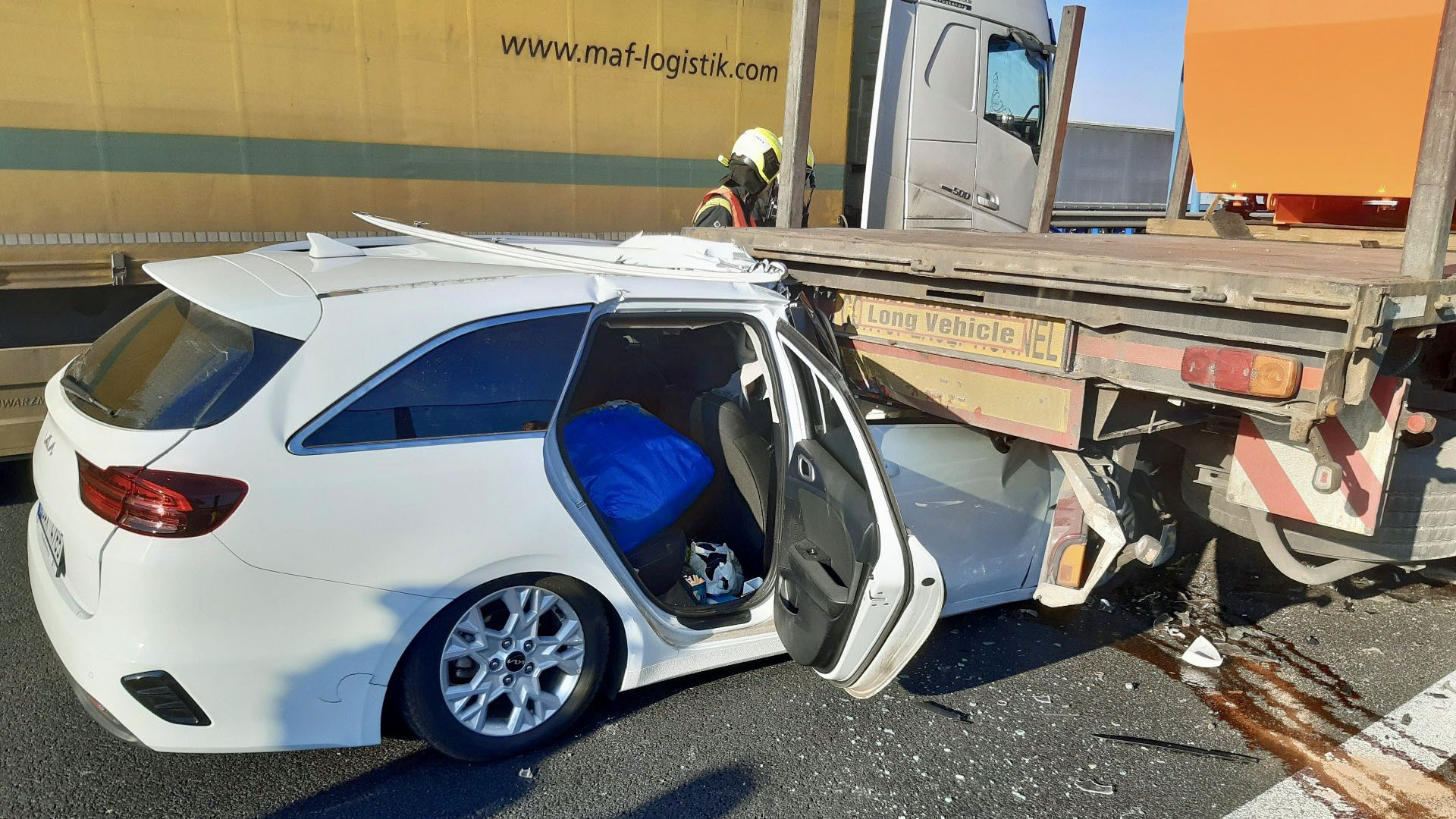 První incident se stal na 14. kilometru pražského okruhu ve směru na letiště, kde došlo ke střetu osobního automobilu s nákladním vozidlem. Řidič osobního auta patrně nestihl dobrzdit, nebo se nevěnoval řízení a narazil do zadní části náklaďáku, kapota auta se zcela nalisovala pod rám náklaďáku.