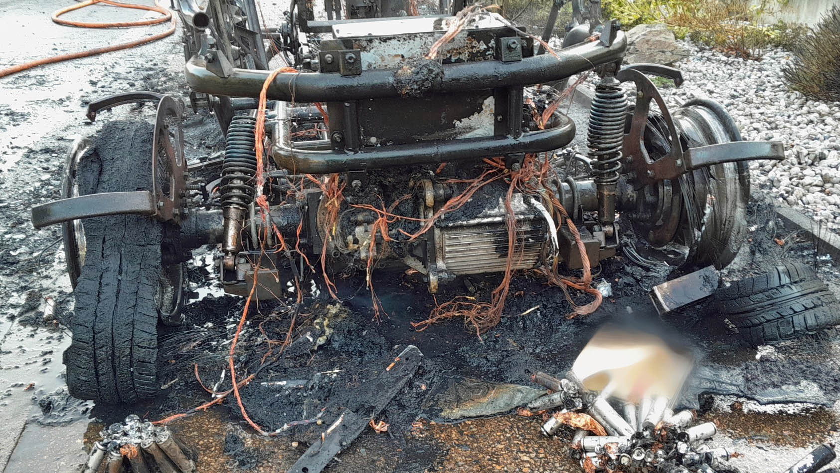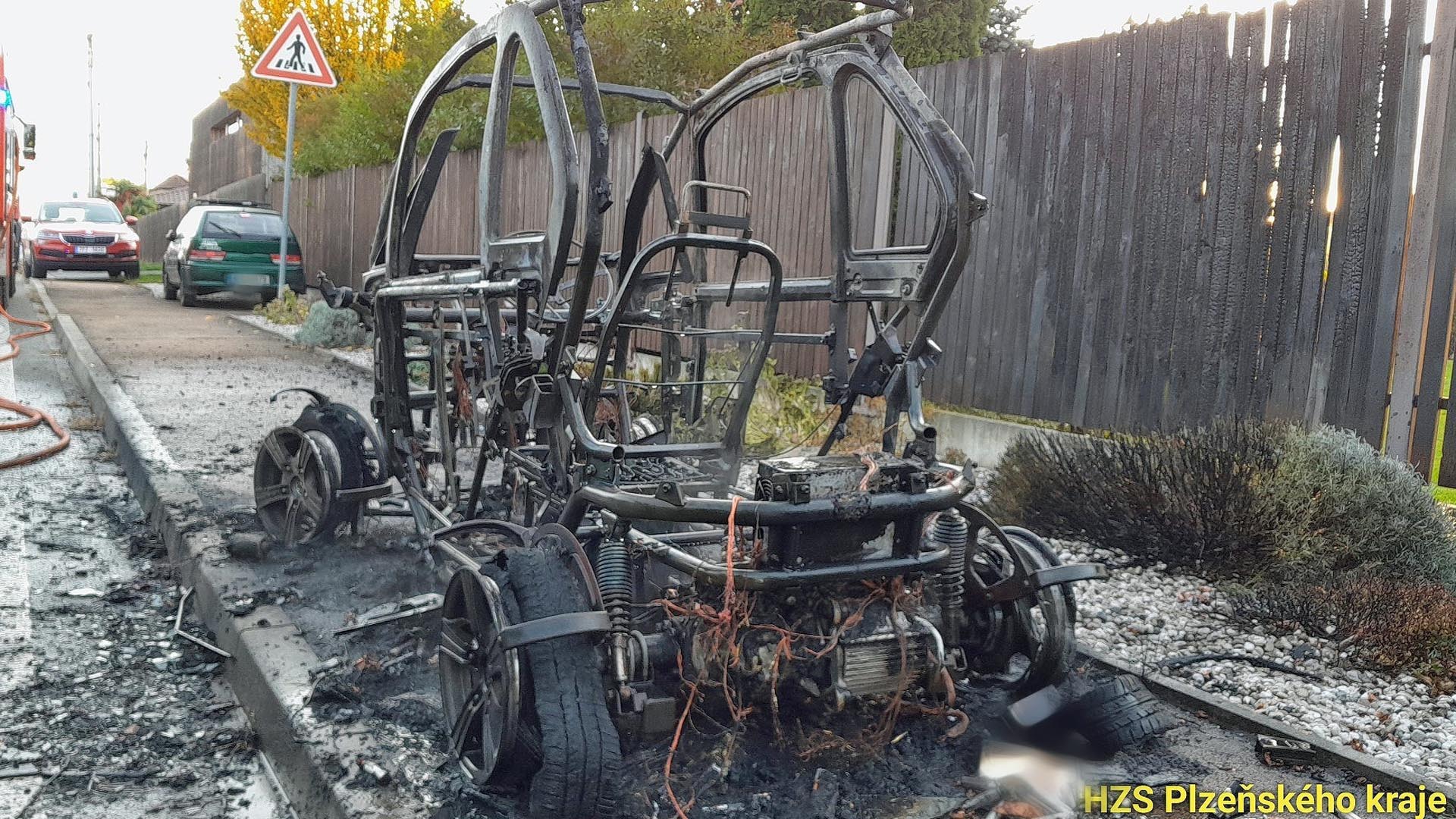 K požáru malého elektromobilu došlo ve čtvrtek v Plzeňské ulici ve Zruči-Senci na Plzeňsku. Vozítko se během chvíle ocitlo zcela v plamenech. Přivolaní hasiči se jej sice snažili uhasit, ale všechny snahy byly marné.