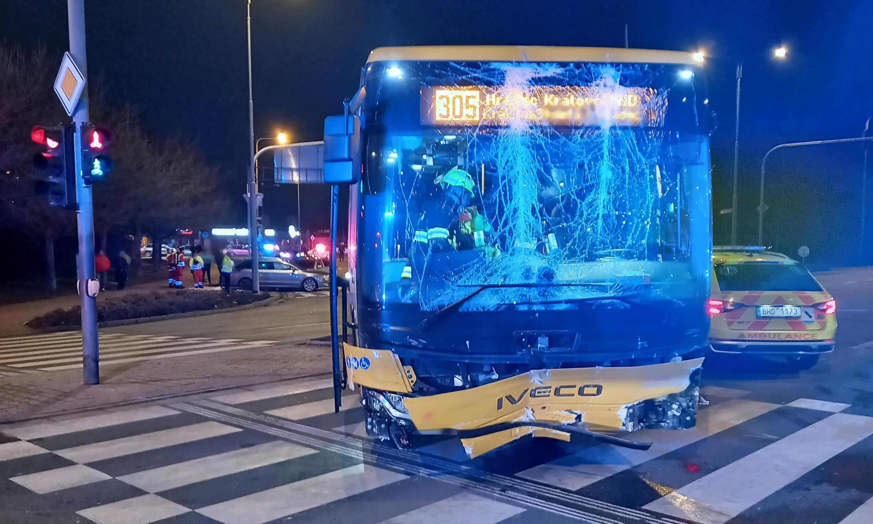 Hasiči, záchranáři a policisté vyjížděli v pondělí před půl šestou večer do ulice Víta Nejedlého v Hradci Králové. Na křižovatce s Kladskou ulicí se srazilo pět vozidel a autobus. Osobní auta skončila značně poškozená, jeden z vozů náraz odhodil na zídku vedle silnice, kterou pobořil. Při nehodě byl zcela zdemolován i stožár uličního osvětlení a dopravní značka.