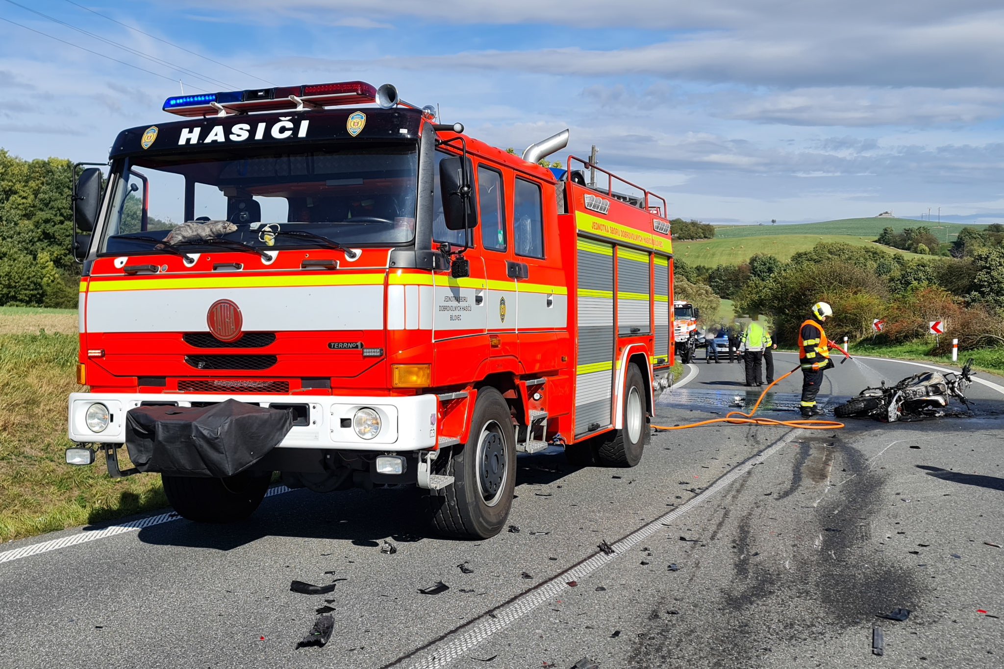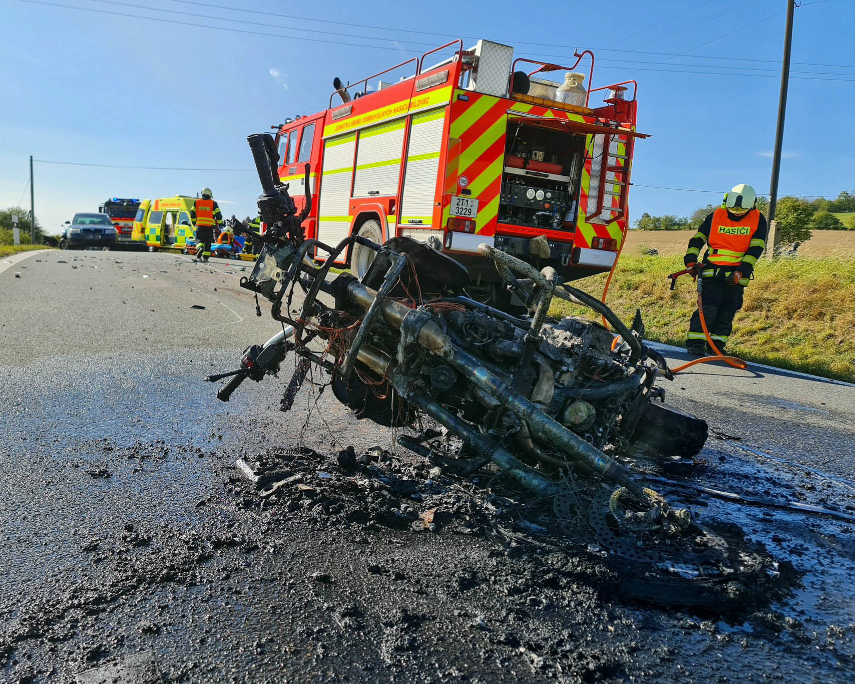 Střet osobního auta a motocyklu u Pohořílek na Novojičínsku skončil tragicky. Motorka po nehodě začala hořet. Záchranu přivolal systém e-call.