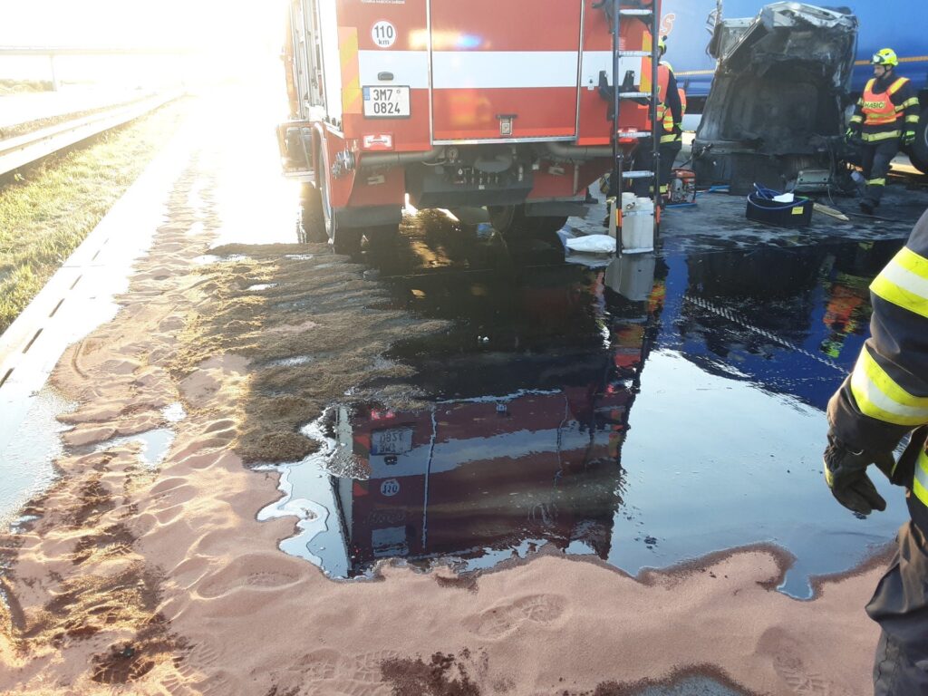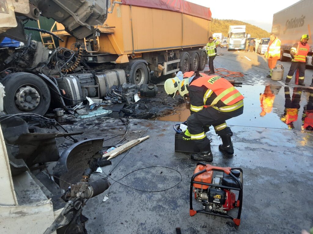 Na dálnici D1 u Milenova se srazily čtyři kamiony, doprava je zastavena