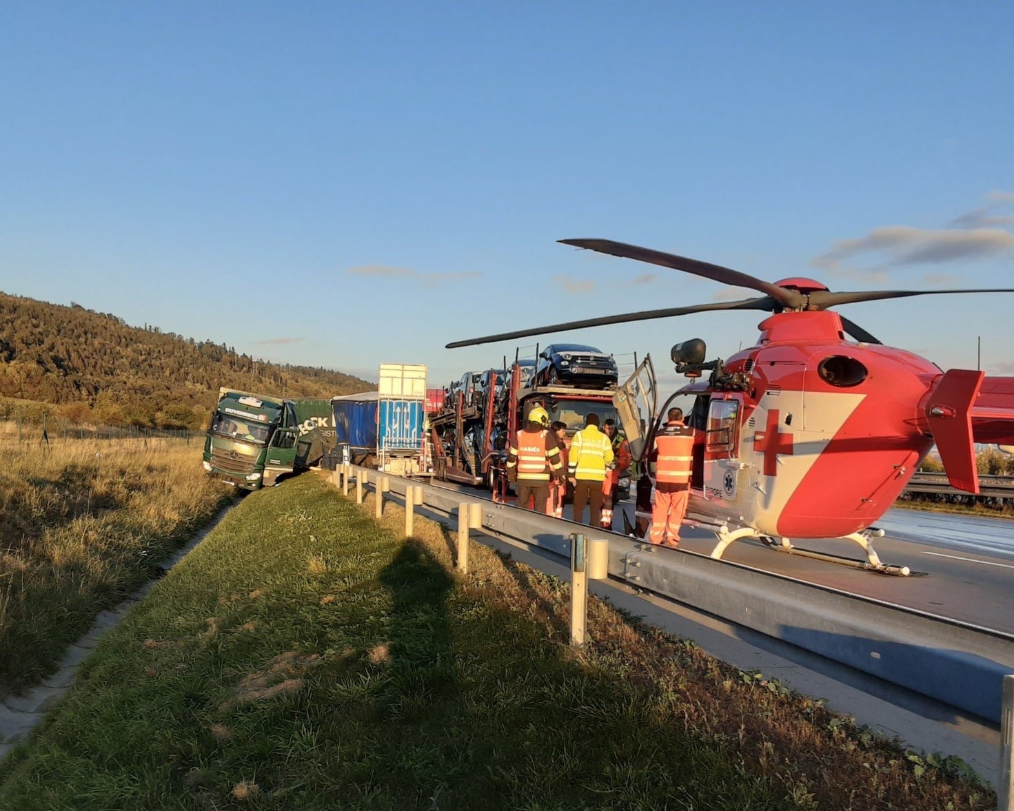 Srazily se tam čtyři kamiony, vyprošťujeme zraněného řidiče nákladního automobilu. Na místě je pět jednotek hasičů, letecká záchranná služba a zdravotnická záchranná služba. Řešíme únik provozních kapalin,“ uvedla mluvčí HZS Olomouckého kraje Lucie Balážová.