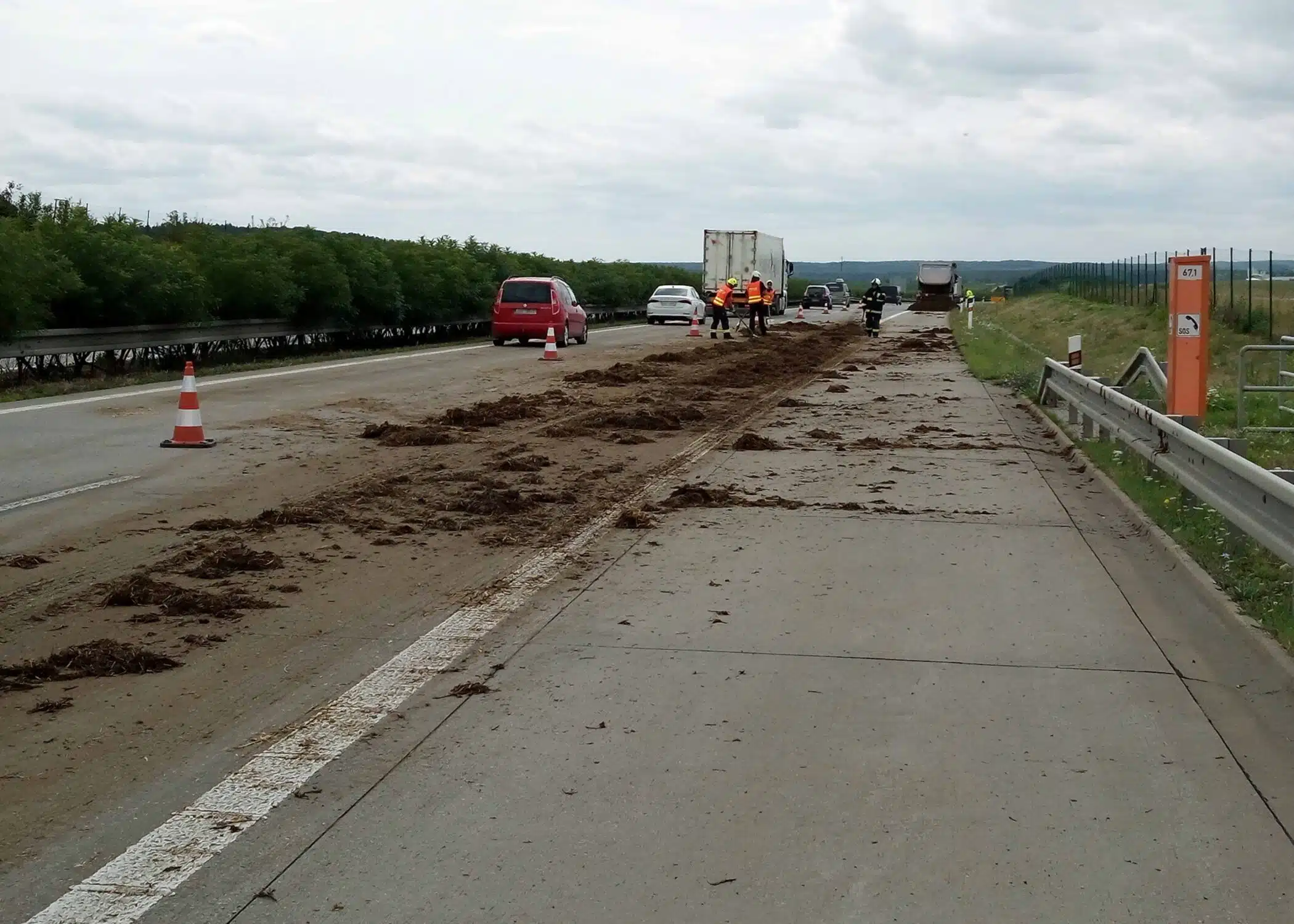 Chlévská mrva se vysypala z projíždějícího nákladního automobilu, kterému se za jízdy otevřelo čelo korby. Práce na dálnici potrvají do zhruba 16.30. Provoz není nijak omezen, ale projíždějte místem s opatrností, hasiči se snaží ne zrovna voňavý náklad co nejrychleji uklidit.