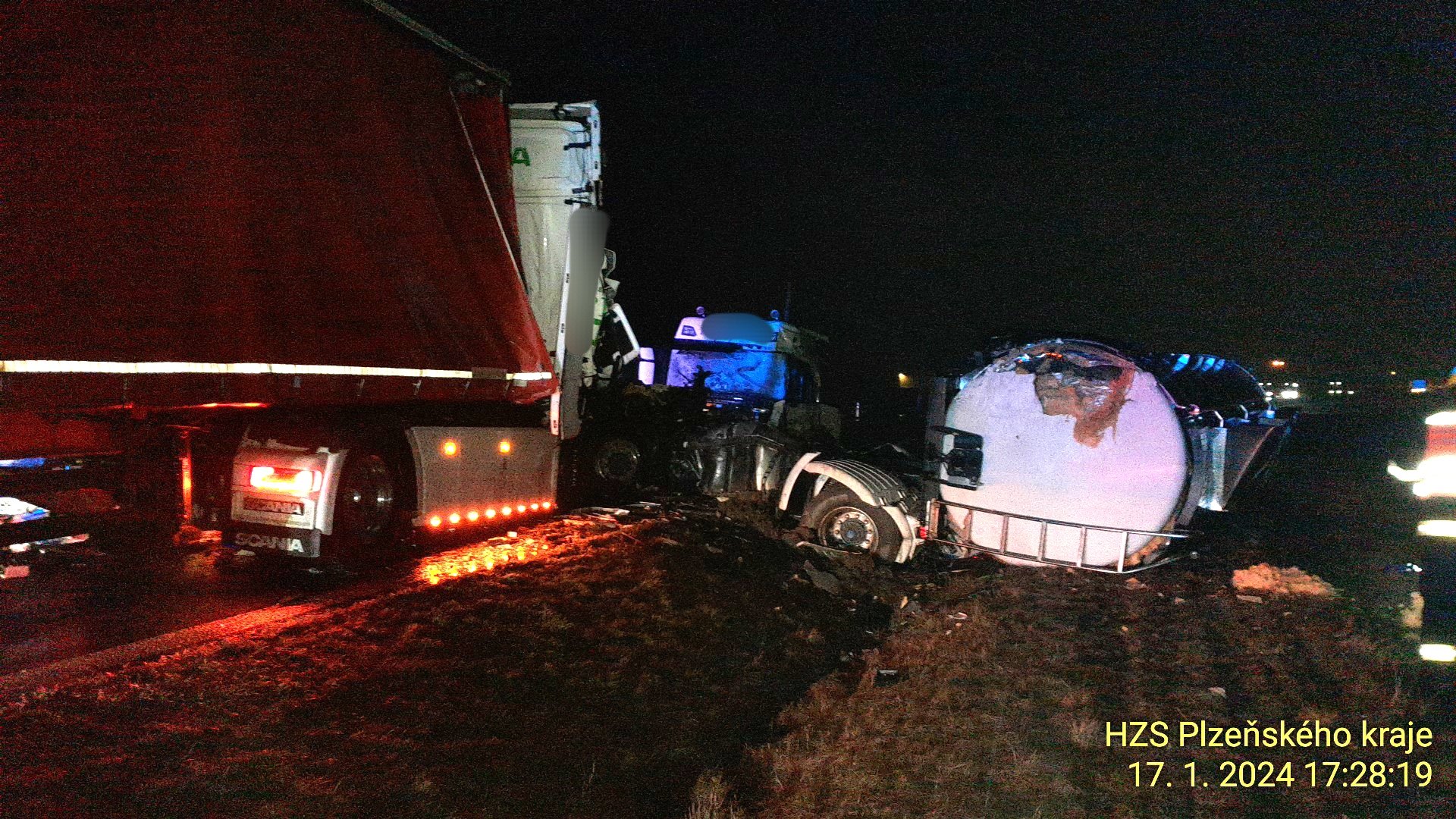 Aby toho nebylo málo, tak se kolem 17. hodiny střetla cisterna s kamionem mezi Meclovem a Březí na Plzeňsku na silnici I/26. Jednu osobu museli hasiči vyprostit. Komunikace bude neprůjezdná do noci. Z obou vozidel dohromady uniklo asi 1000l nafty a oleje.