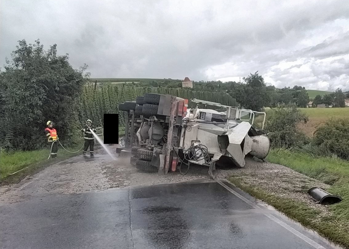 „Na místo vyjela jednotka hasičů ze stanice Louny,“ informovali hasiči HZS Ústeckého kraje. Hasiči ihned začali vozovku omývat proudem vody, aby beton na silnici neztuhl. Následovat bnude vyproštění těžkého kolosu. Příčiny nehody na místě vyšetřuje policie.