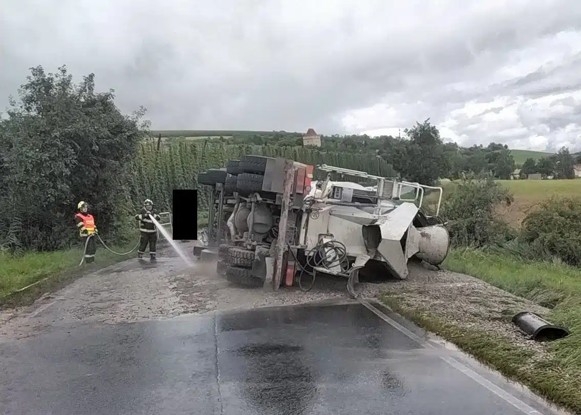 Nepříjemná nehoda míchačky na beton se stala v pondělí před polednem u Divic na Lounsku. Míchačka se tam převrátila na bok a na silnici se vylil čerstvý beton.
