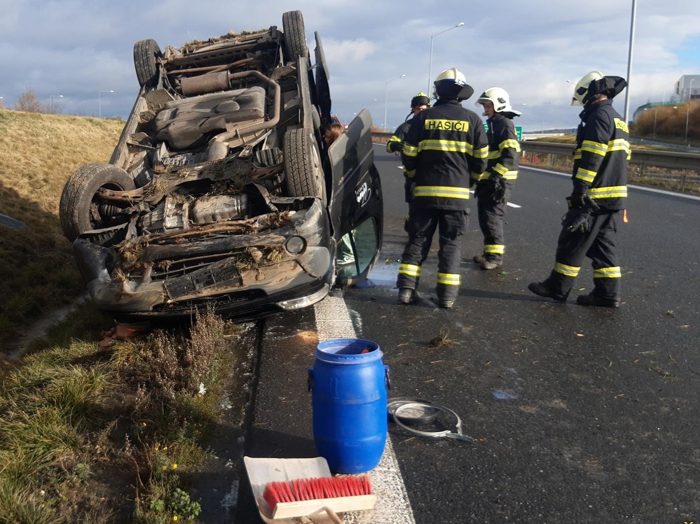 Pořádně adrenalinovou nehodu má za sebou trojice, která v neděli sjížděla v černé dodávce Renault Trafic z brněnské dálnice D1 na Pražský okruh. Dodávka se právě na sjezdu převrátila tak nešťastně, že skončila na střeše.