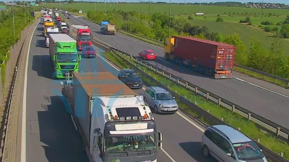 Ještě v půl desáté byl průjezd kolonou na Pražském okruhu nejméně na hodinu a asi na 50 minut na dálnici D5. Nedá se vyloučit, že při nakládání kamene bude provoz dopoledne zcela zastaven.