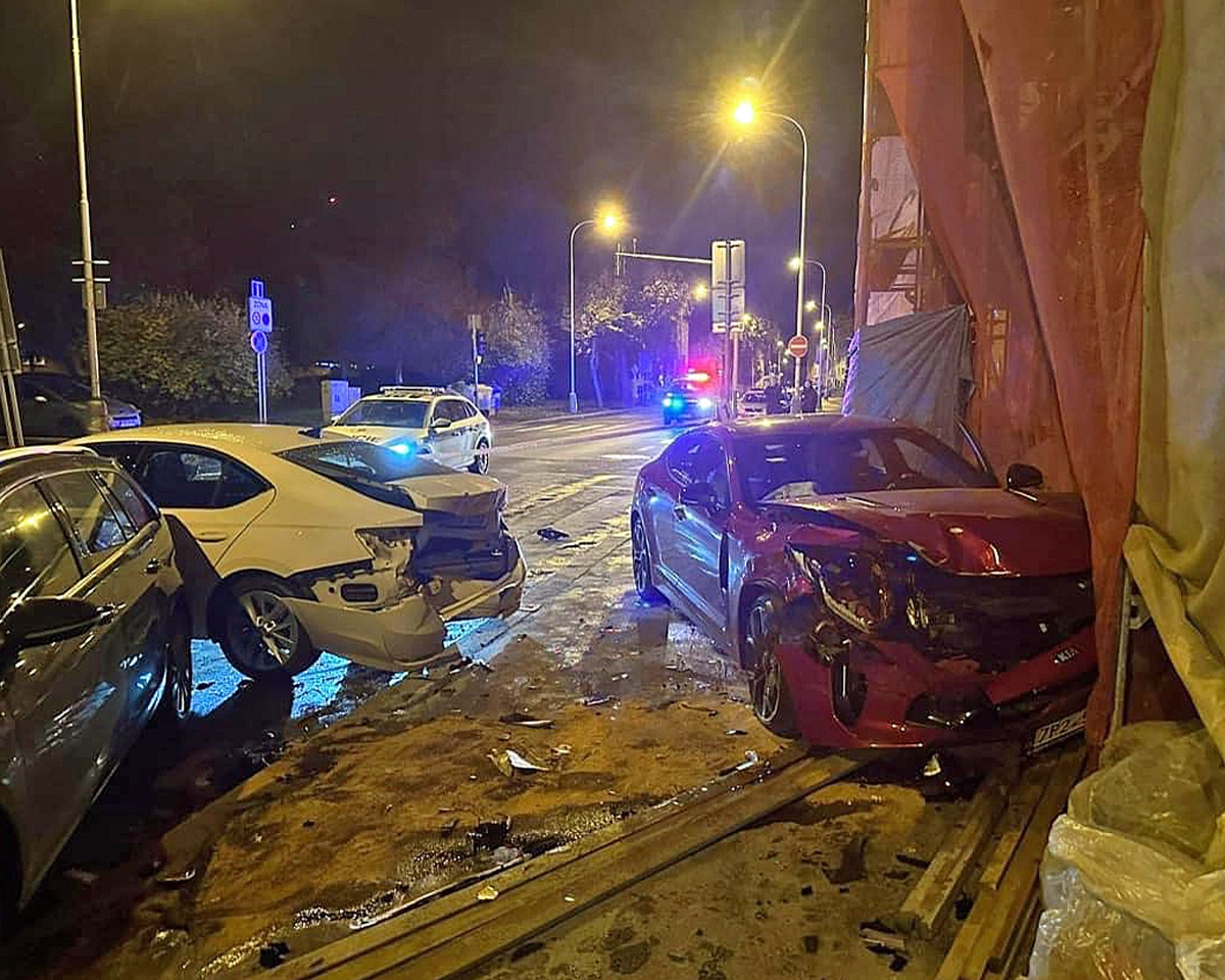 Noční nehoda se stala na Praze 5 na křižovatce ulic Vrchlického a Mahenova. Řidič červeného vozu tam ve vysoké rychlosti doslova rozstřelil tři jiná auta a sám pak s vozem naboural do rekonstruovaného domu s lešením.